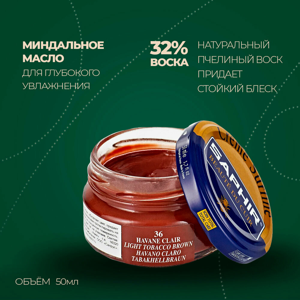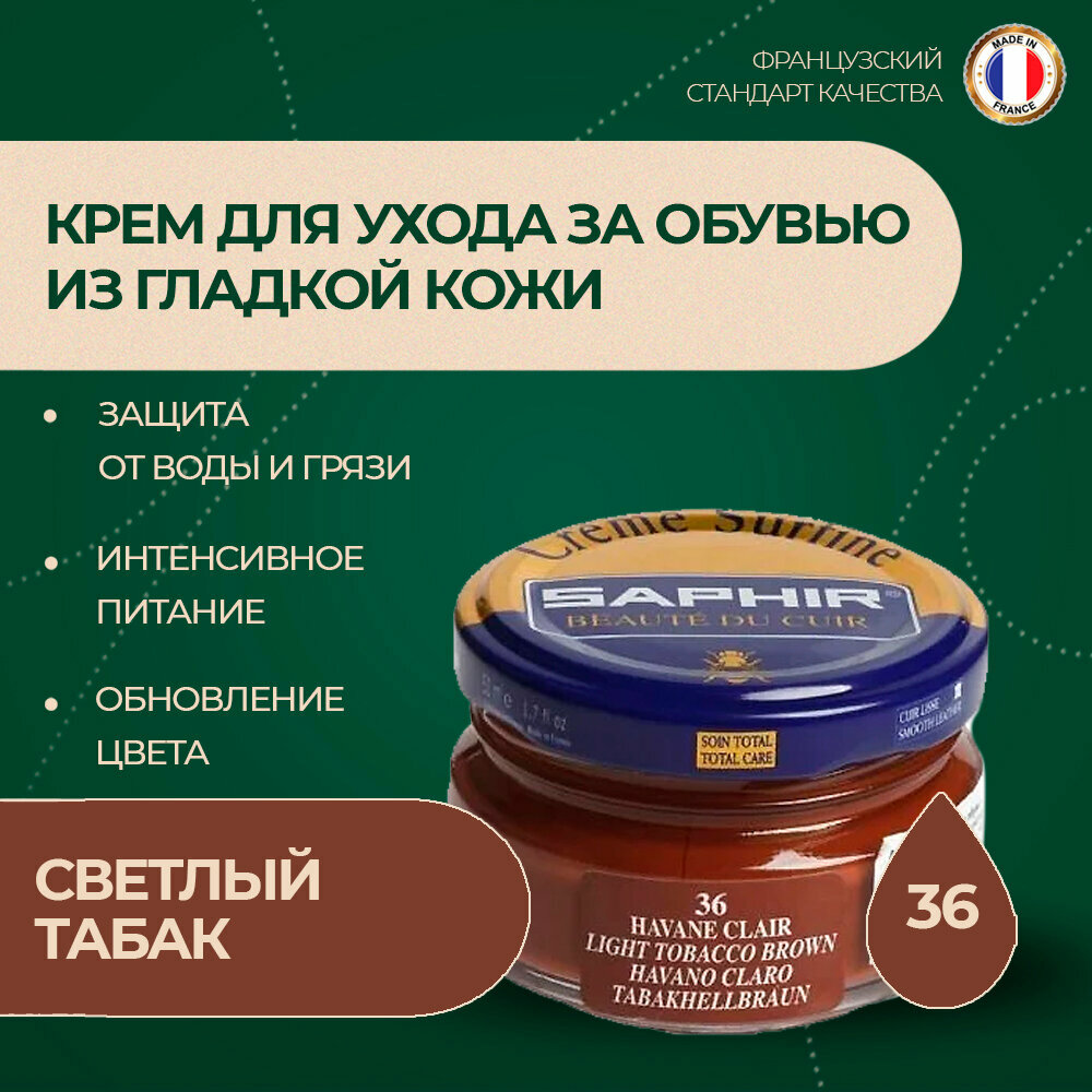 Крем Saphir Creme Surfine для обуви из гладкой кожи 50 мл, цвет 36 светло-коричневый (havane clair)