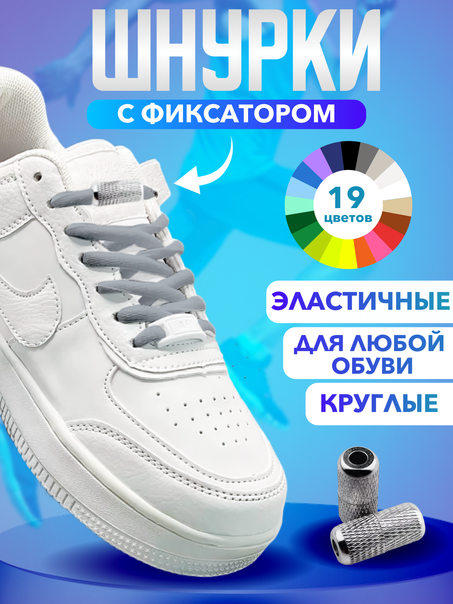 Шнурки для обуви эластичные круглые с фиксаторами зажимами рифлеными голубые - 1 пара