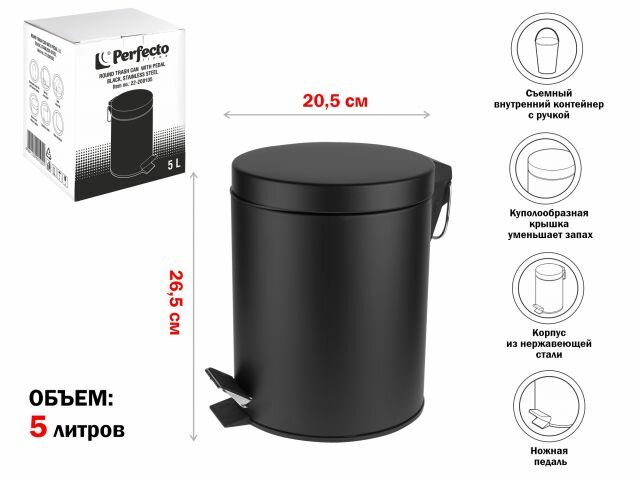 Ведро для мусора с педалью, 5 л, черное, нержавеющая сталь, PERFECTO LINEA (22-200105) интересное: