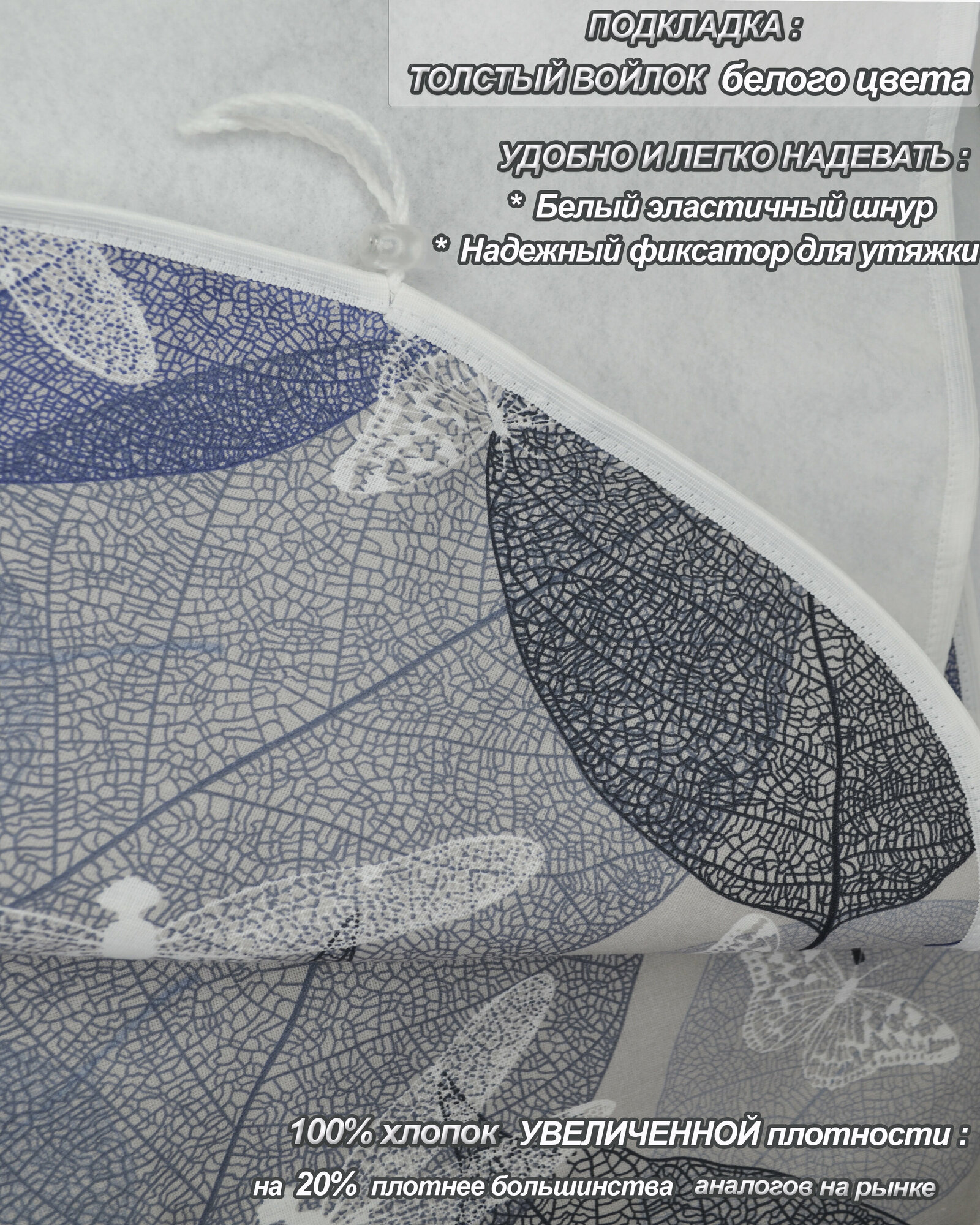 | Подробная комплектация | универсальный чехол - покрытие на гладильную доску, подложка подкладка войлок (синтепон), верх 100% хлопок, эластичный белый шнур полиэфир, фиксатор пластмассовый для утяжки чехла, шнура |