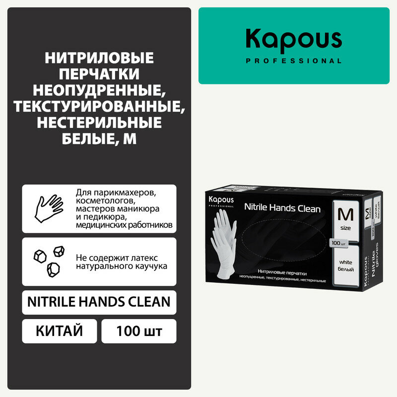 Купить Нитриловые перчатки неопудренные, текстурированные, нестерильные Kapous "Nitrile Hands Clean", белые, 100 шт., M