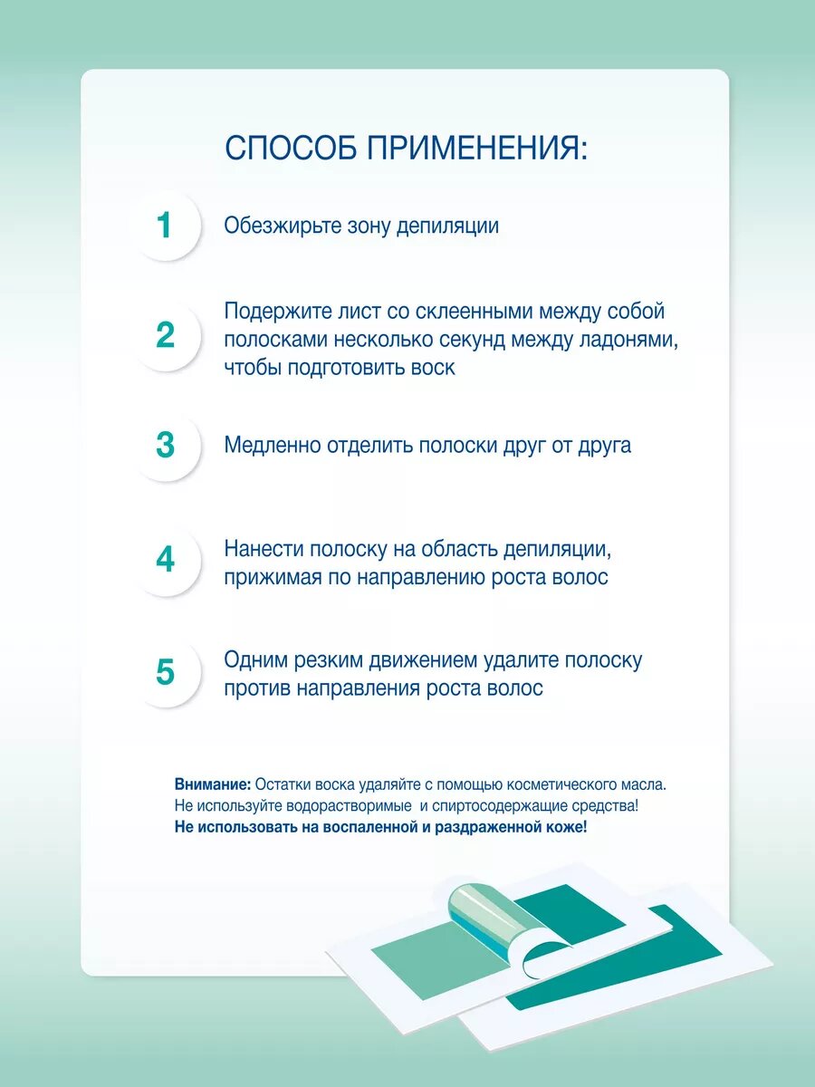 | Способ применения | 1. Для лучшего прилегания воска, перед процедурой удаления волос необходимо обезжирить предполагаемый участок депиляции. Для этого протрите зону депиляции любым спиртосодержащим лосьоном. 2. Возьмите лист со склеенными между собой полосками. Расположите его между ладонями, нагрейте полоски в течение 25-30 сек. 3. Разъедините склеенные между собой полоски и наклейте их на кожу, разглаживая по направлению роста волос. 4. Одним резким движением удалите полоску против направления роста волос. 5. После полного удаления волос на всей области депиляции, удалите остатки воска с помощью косметического масла (ф 127f) и нанесите крем-гель после депиляции, который успокаивает, увлажняет кожу и способствует замедлению роста волос. |