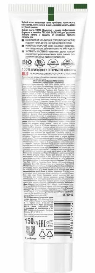 Лесной бальзам Паста зубная Total Комплекс Антиналет с морской солью, экстрактом имбиря и чаем матча, 150 г, , 20 шт.