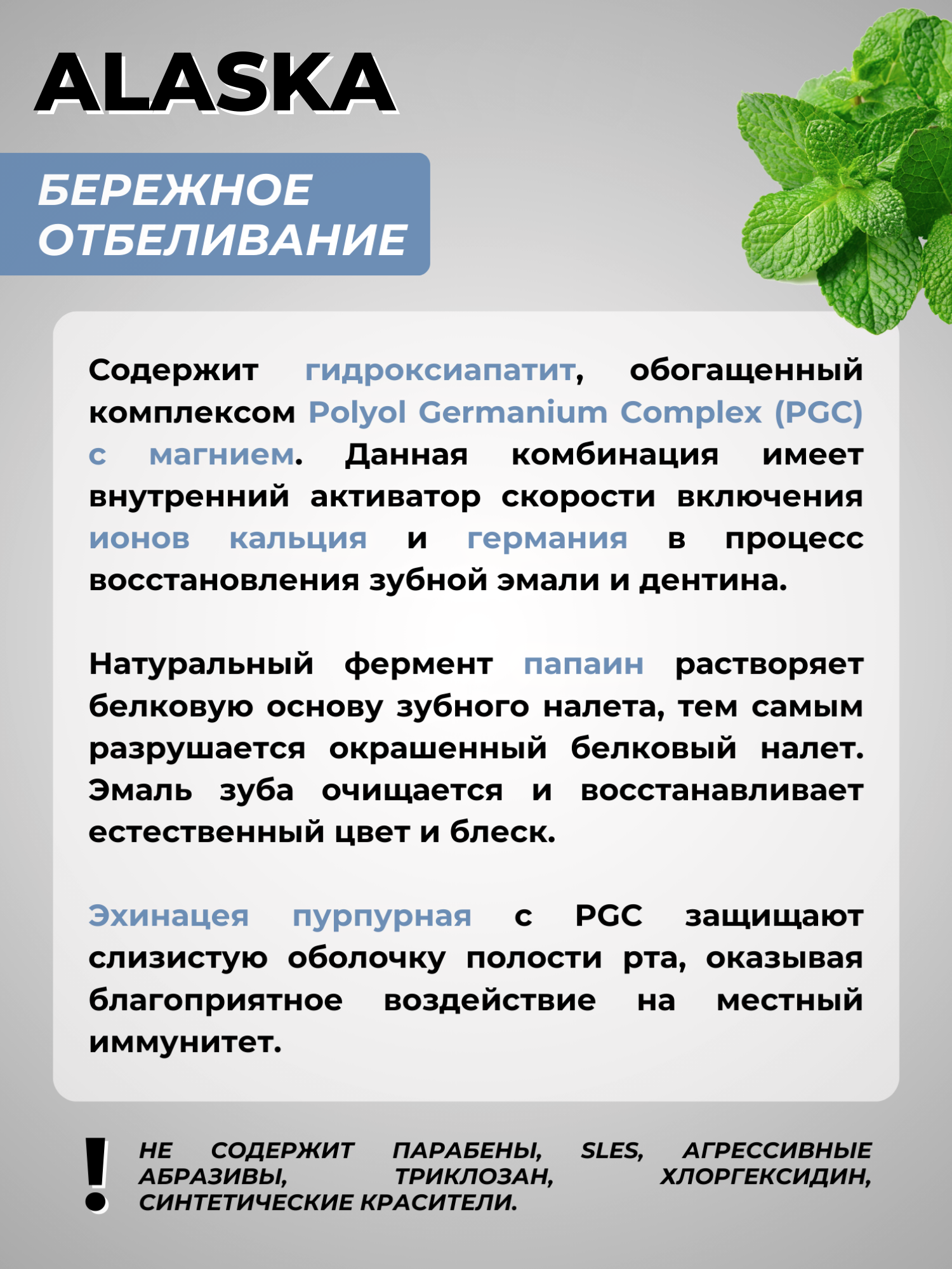 | Состав | Вода, глицерин, пропиленгликоль, ксантановая камедь, ароматизатор, сорбитол, кремния диоксид, ментол, натрия кокоил метил таурин, гидроксиапатит, натрия сахарин, гидроксиацетофенон, папаин, экстракт эхинацеи пурпурной, биосол, polyol Germanium Complex PGC with Magnesium |