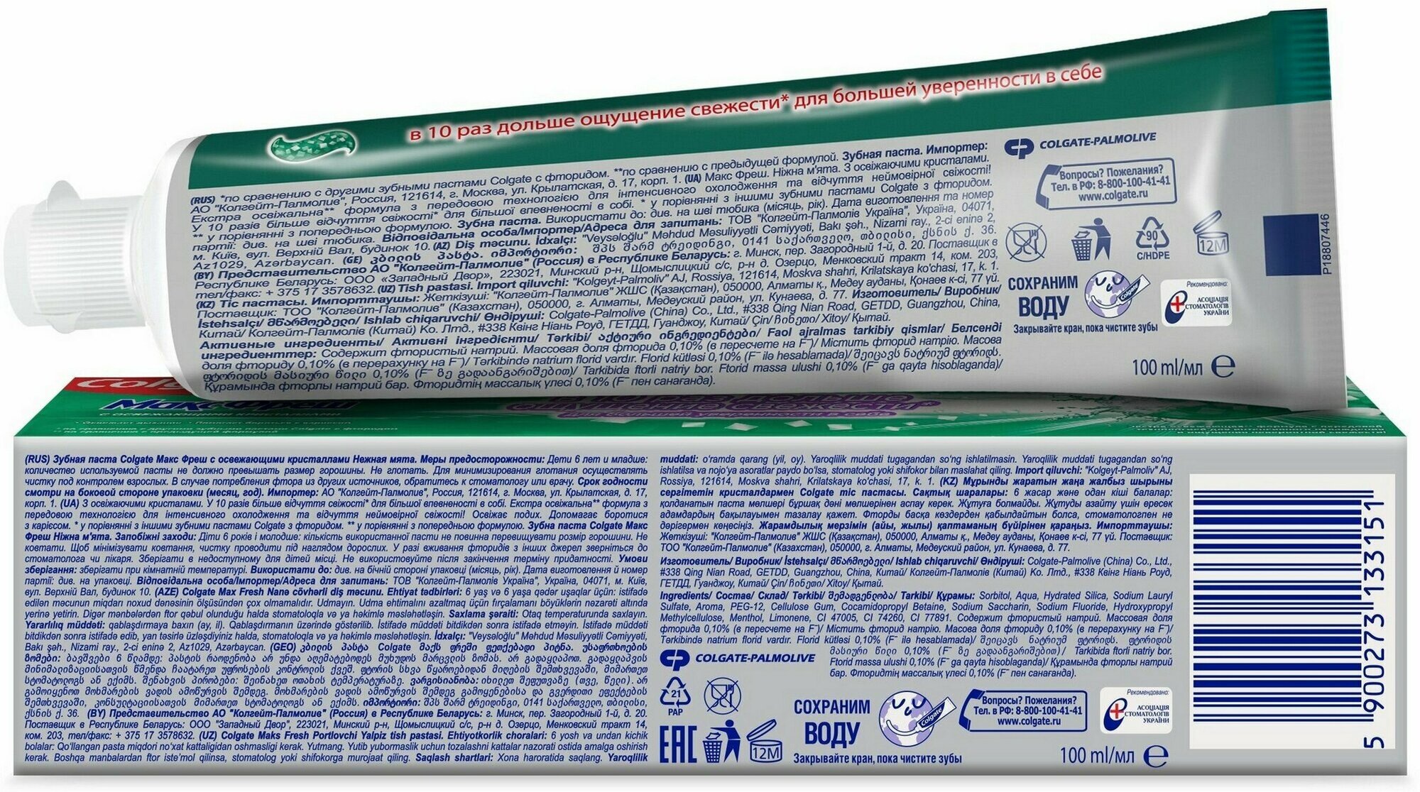 | Дополнительная информация | состав: sorbitol, aqua, hydrated silica, sodium lauryl sulfate, aroma, PEG-12, cocamidopropyl betaine, sodium saccharin, sodium fluoride, hydroxypropyl methylcellulose, cellulose gum, menthol, limonene, CI 77891, CI 47005, CI 74260 |