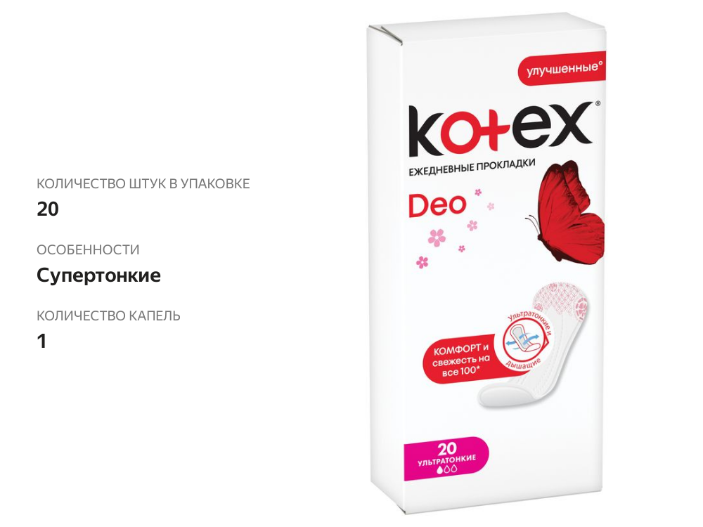 Ниже Вы можете прочитать отзывы на Прокладки ежедневные Kotex Deo Ультратонкие 20шт, ознакомится с подробными характеристиками, посмотреть интересные обзоры и фотографии на Прокладки ежедневные Kotex Deo Ультратонкие 20шт.