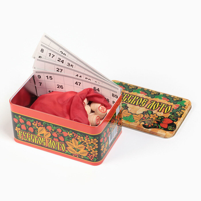 Русское лото, 24 карточки, карточка 22 х 8 см, бочонок 2.3 х 1.5 см, жестяная упаковка