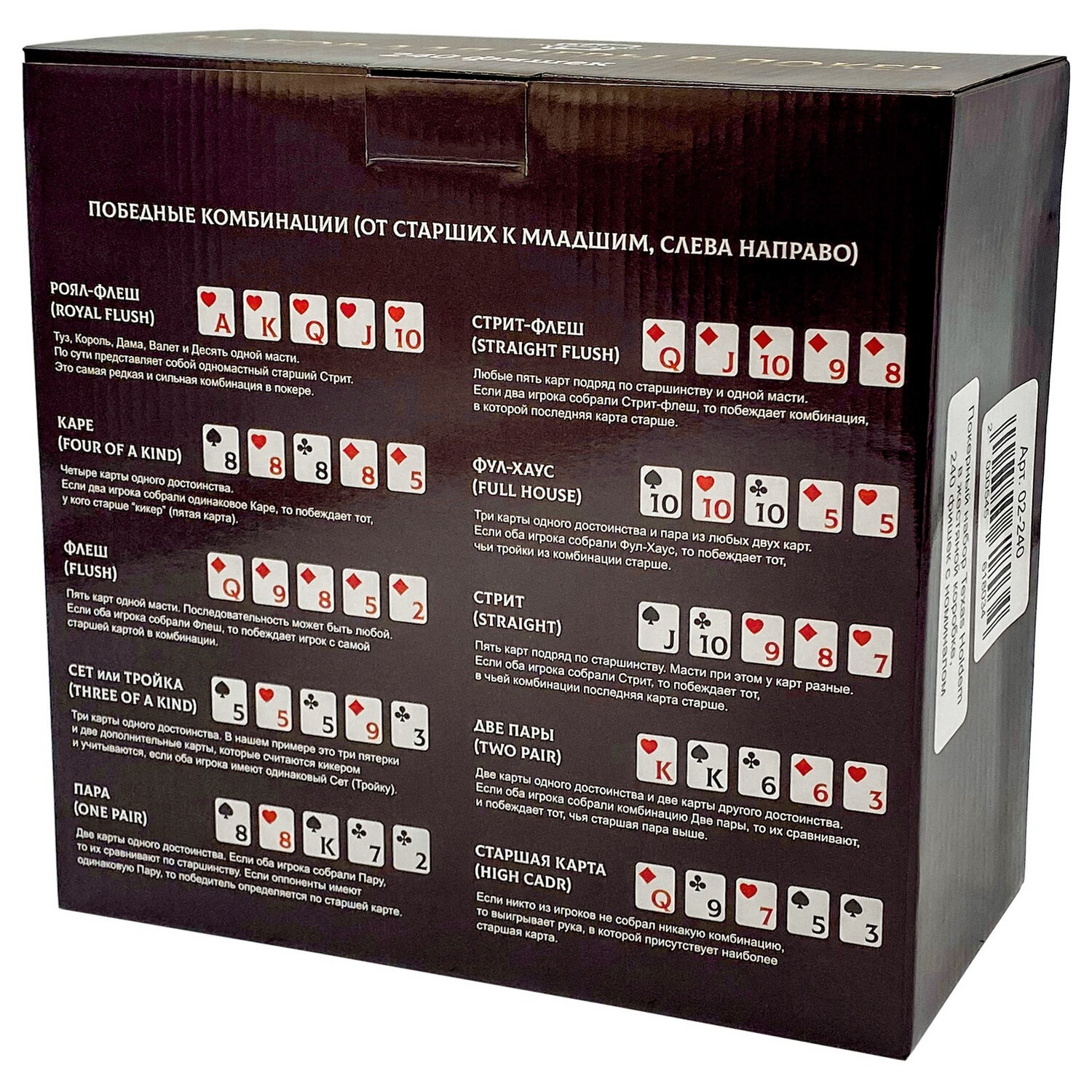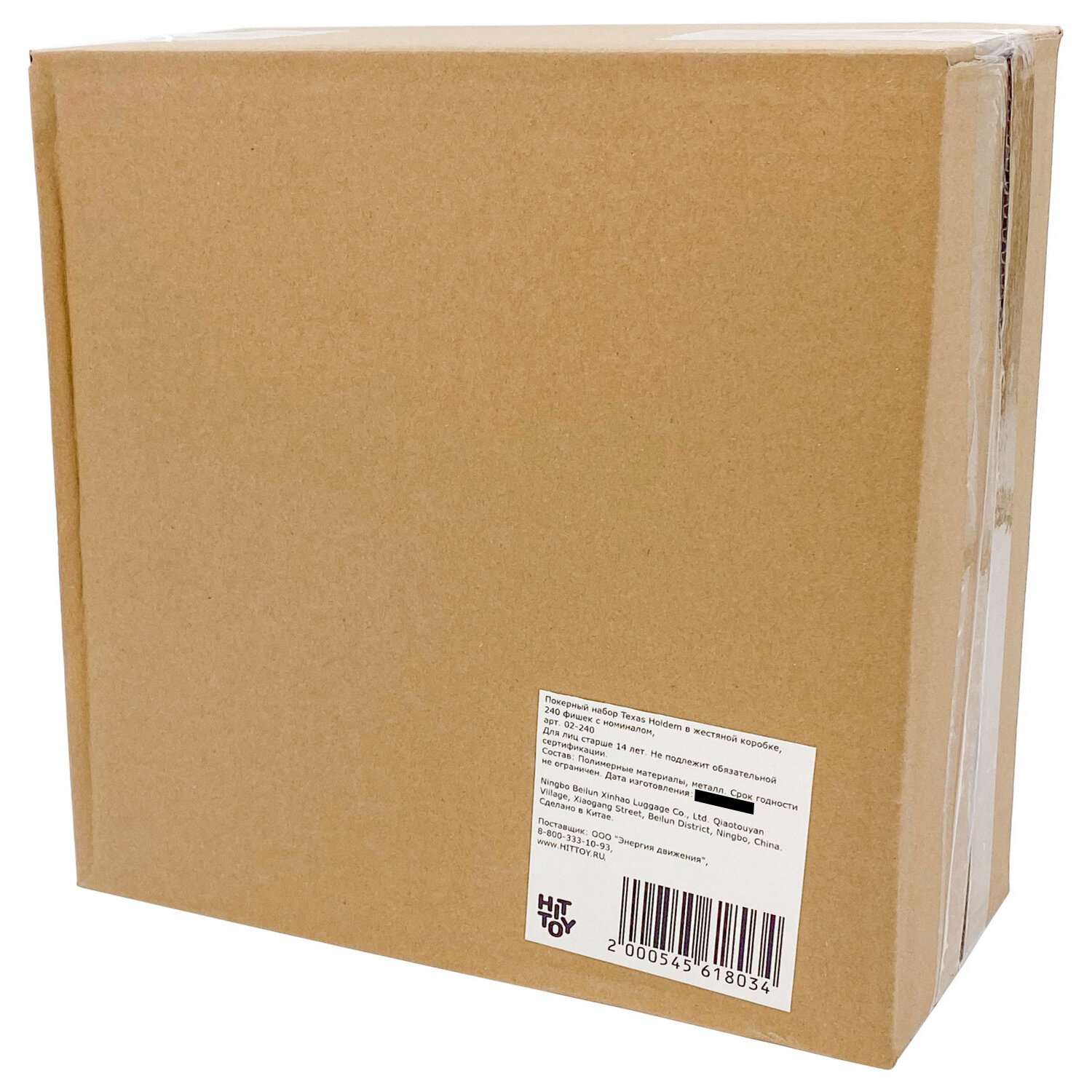 | В наборе | игровые фишки - 240 шт., ламинированные карты - 2 колоды по 54 шт., фишка дилера, фишки Big blind и Small Blind, жестяная коробка |