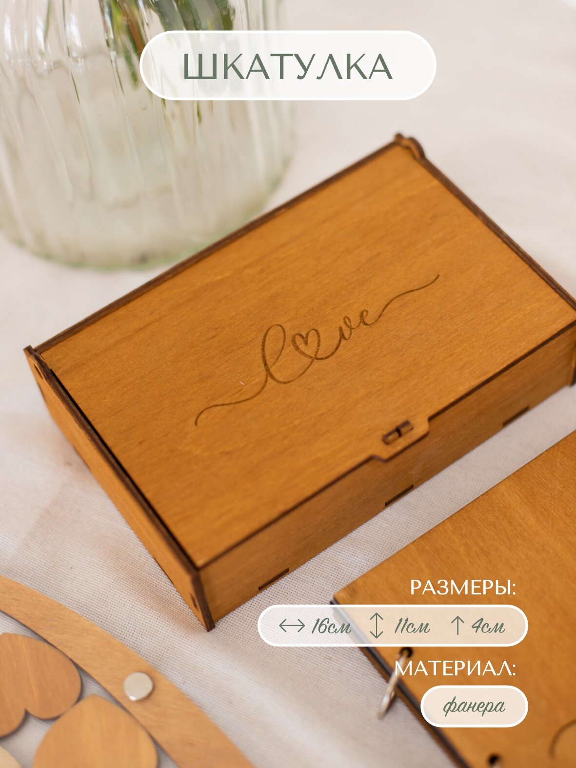 | Комплектация | сердце-рамка для пожеланий; шкатулка с сердцами; книга для пожеланий; уголки для фото; маркеры для надписи 2 шт; |