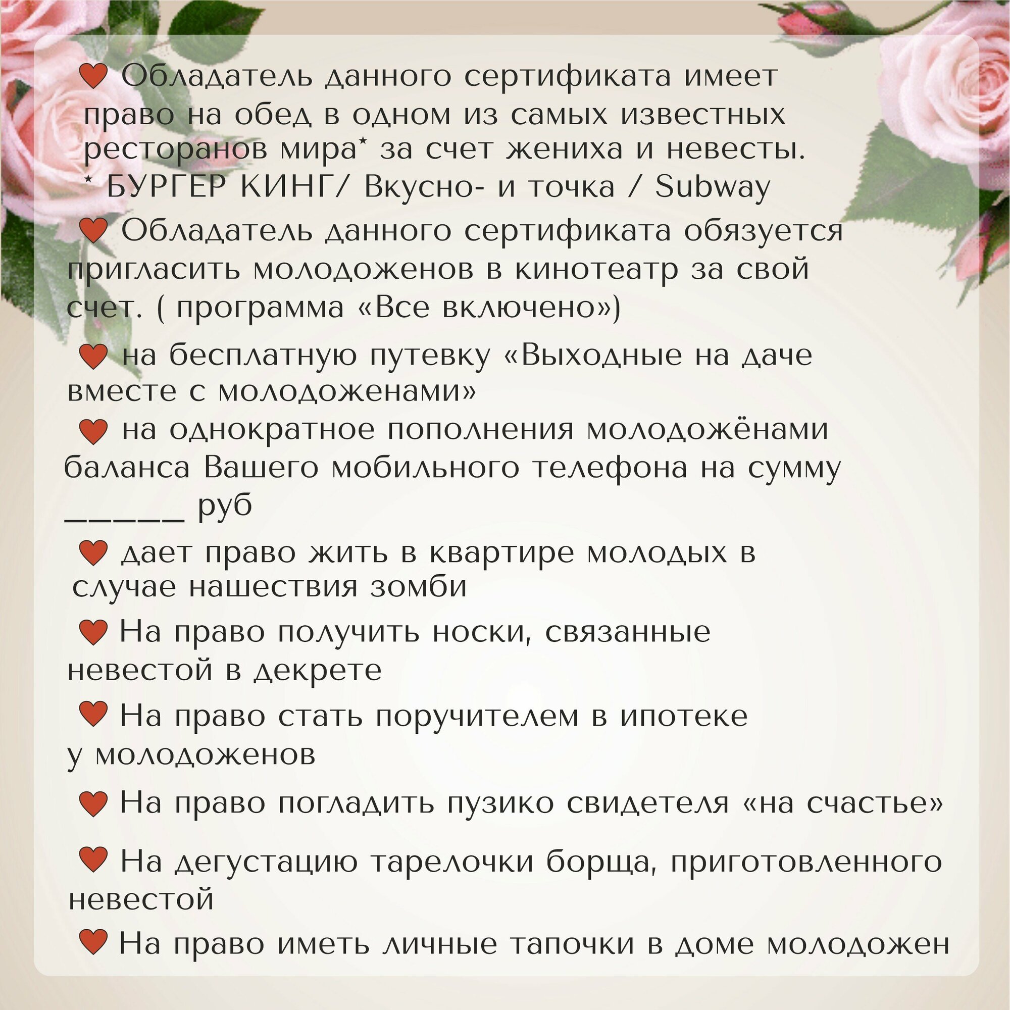 Свадебные шуточные сертификаты для конкурсов. 10 шт. 10х15 см