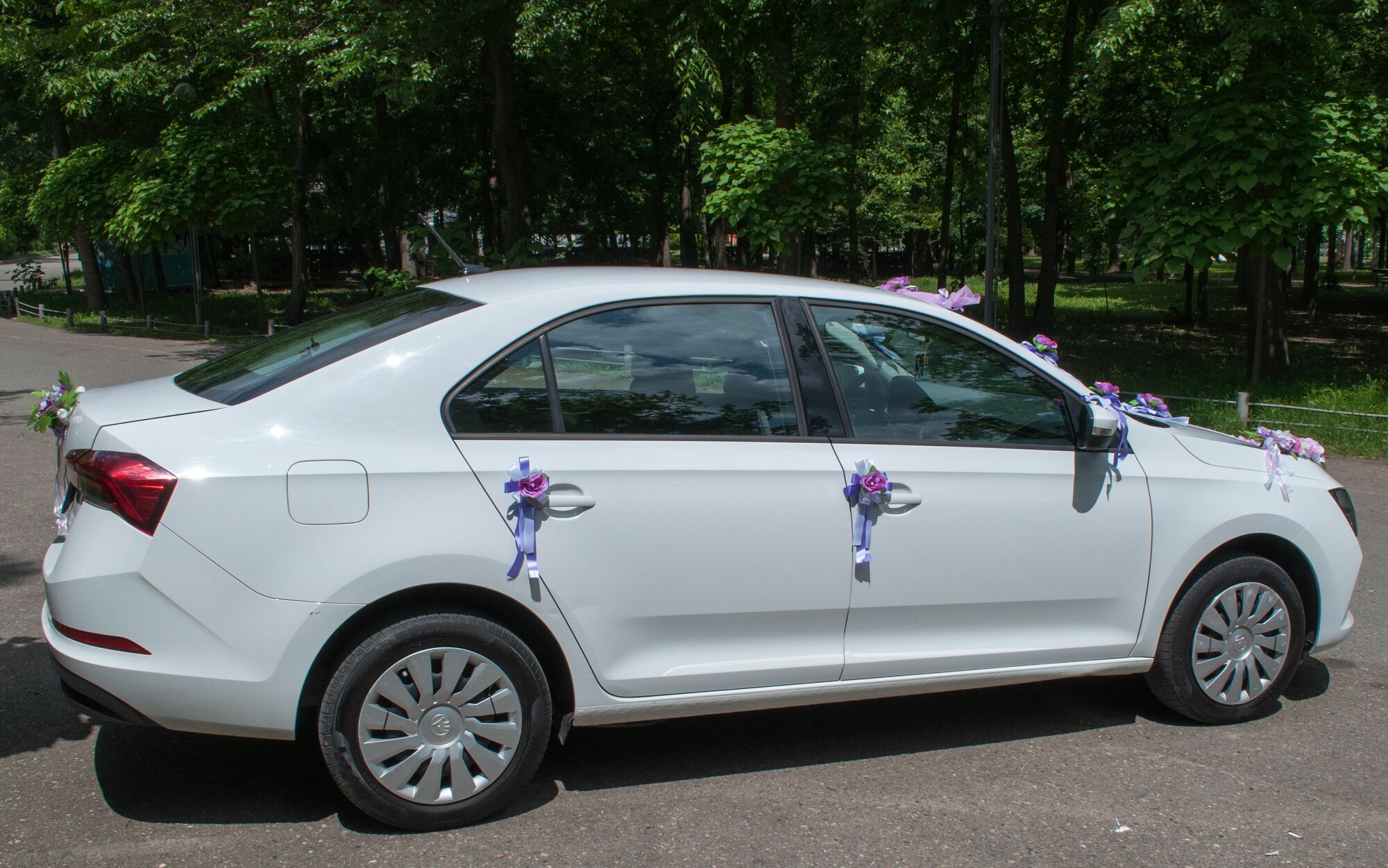 | Комплектация | В состав комплекта (всего 14 позиций) входит: 1. Полупрозрачная салатовая лента с цветком и бантиками на крышу/стекло машины - 125 см. длиной 2. Две цветочные гирлянды на капот, каждая по 100 см. длиной 3. Цветочная гирлянда 50 см. длиной на багажник 4. Банты с цветами на присосках - 10 шт. Все украшения собраны на мягких основах. Крепятся на силиконовые присоски и ленты. Для надежной фиксации важно чтобы автомобиль был чистым, а присоски были хорошенько смочены водой внутри. Обычно комплект доставляется в приличном виде за счет большой коробки. Но если есть необходимость тканевые ленты можно дополнительно разгладить утюгом на минимальной температуре (лучше сначала поэкспериментировать на кончиках лент). |