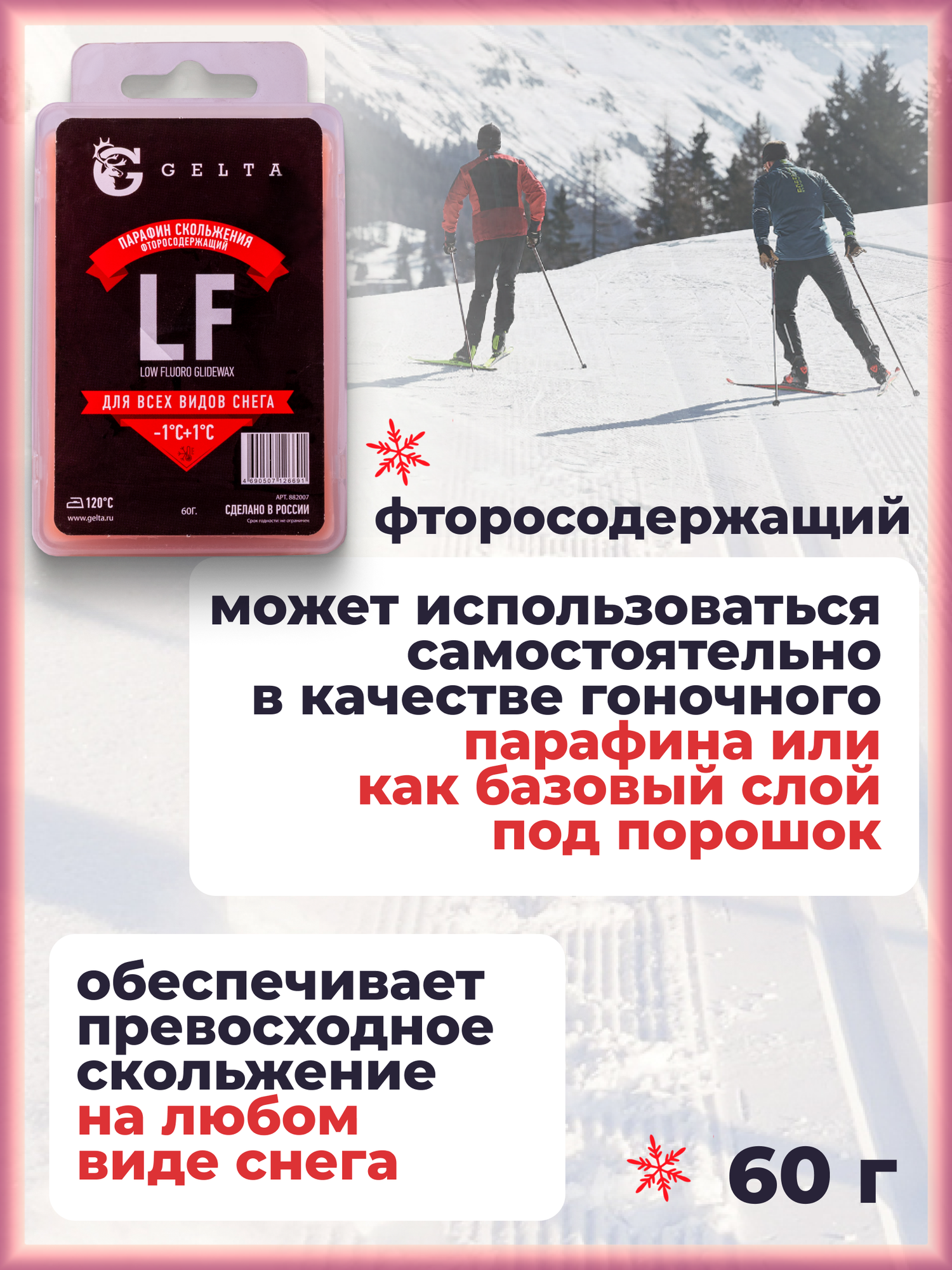 Парафин твердый для лыж и сноубордов Gelta LF -1/+1°C воск скольжения лыжный 60 грамм