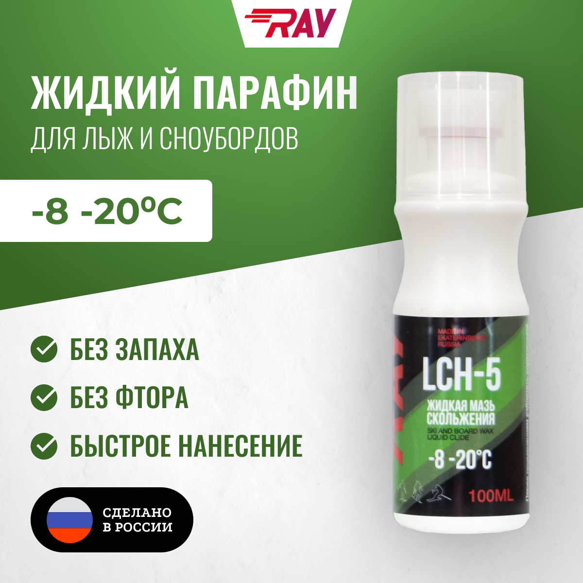 Жидкий парафин для лыж RAY CH-5 от -8 до -20 без фтора, с аппликатором 100 мл, зеленая. Жидкая мазь скольжения. интересное: