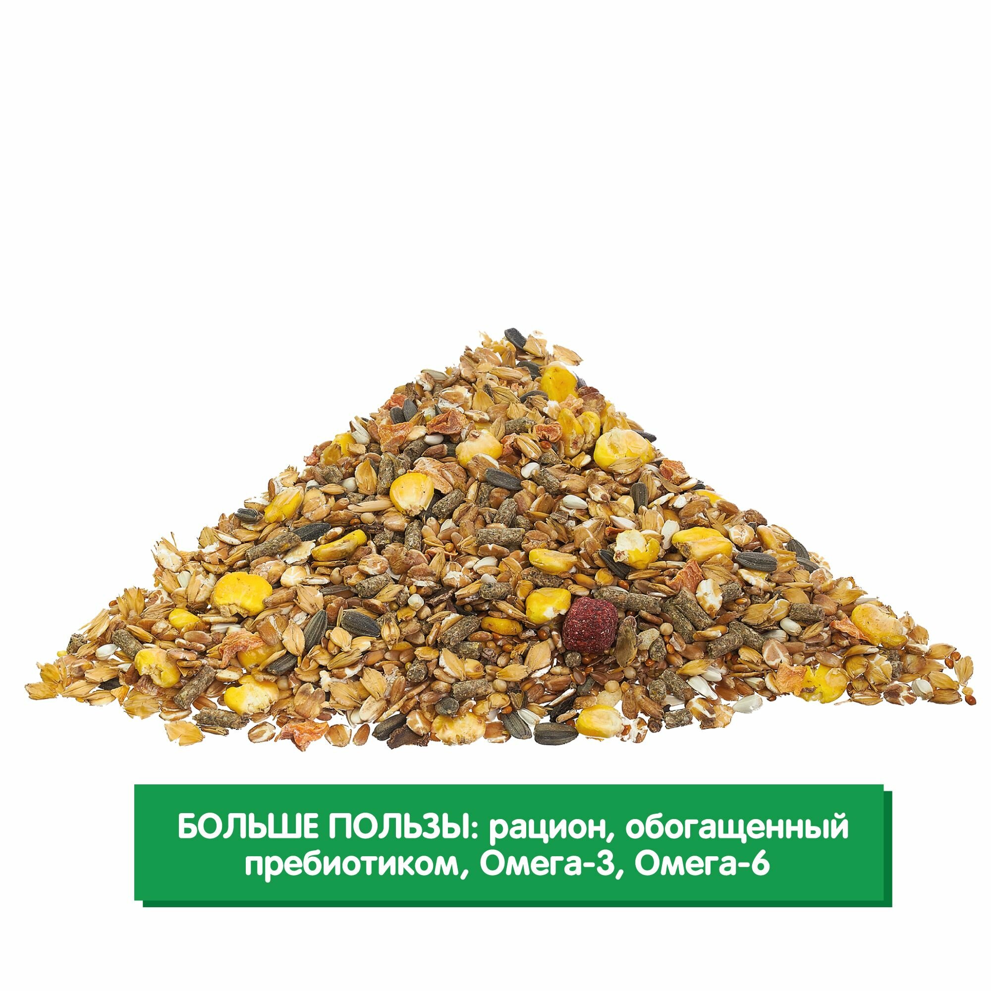| Состав | пшеница, пшеница воздушная, ячмень воздушный, зерновые гранулы (т.ч. юкка шидигера, пребиотик, омега-3 и -6), просо желтое, просо красное, хлопья кукурузные, лен, сафлор, сорго, семечка подсолнечника, рожковое дерево, экструдированные гранулы, морковь, арахис, банановые чипсы, ананас сушенный |