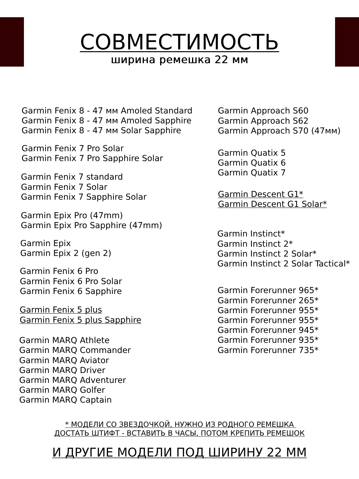 | Совместимые модели умных часов | Garmin Descent Mk1, Garmin Descent Mk2, Garmin Descent Mk2i, Garmin Fenix 3, Garmin Fenix 3 HR, Garmin Fenix 3 Sapphire, Garmin Fenix 5X, Garmin Fenix 5x Plus, Garmin Fenix 6X Pro Solar, Garmin Fenix 6x, Garmin Fenix 6x Pro, Garmin Fenix 7X Solar, Garmin Fenix 7x, Garmin Tactix Delta Solar |