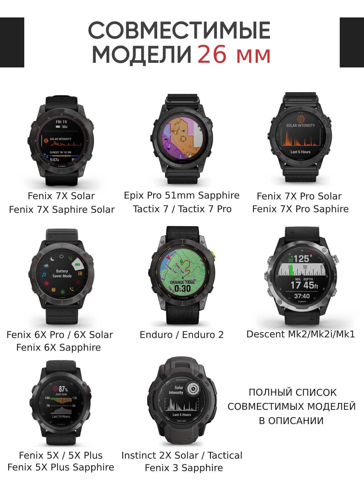 | Совместимые модели умных часов | Garmin Descent Mk1, Garmin Descent Mk2, Garmin Descent Mk2i, Garmin Fenix 3, Garmin Fenix 3 HR, Garmin Fenix 3 Sapphire, Garmin Fenix 5X, Garmin Fenix 5x Plus, Garmin Fenix 6X Pro Solar, Garmin Fenix 6x, Garmin Fenix 6x Pro, Garmin Fenix 7X Solar, Garmin Fenix 7x, Garmin Tactix Delta Solar |