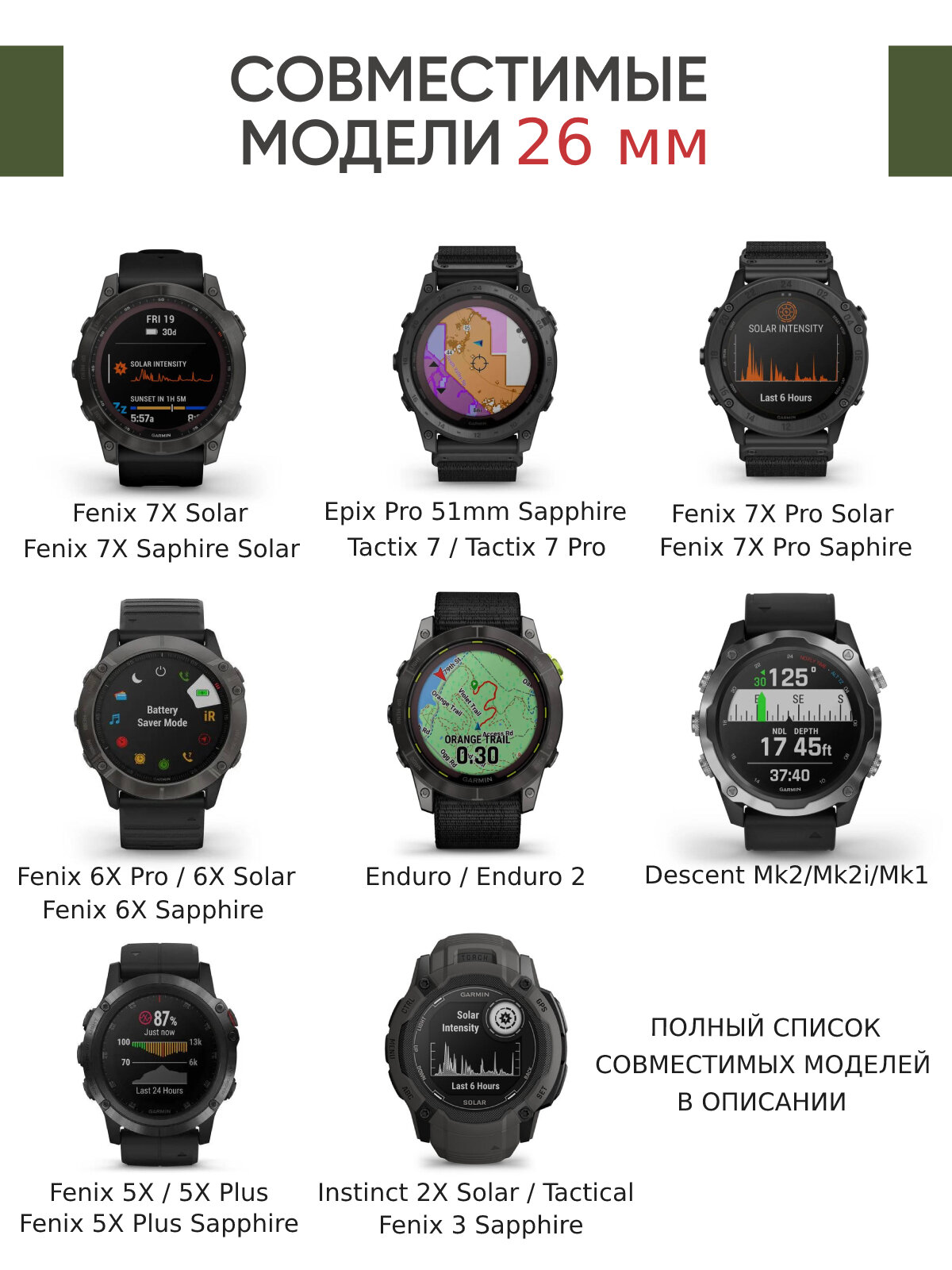 | Совместимые модели умных часов | Garmin Descent Mk1, Garmin Descent Mk2, Garmin Descent Mk2i, Garmin Fenix 3, Garmin Fenix 3 HR, Garmin Fenix 3 Sapphire, Garmin Fenix 5X, Garmin Fenix 5x Plus, Garmin Fenix 6X Pro Solar, Garmin Fenix 6x, Garmin Fenix 6x Pro, Garmin Fenix 7X Solar, Garmin Fenix 7x, Garmin Tactix Delta Solar |