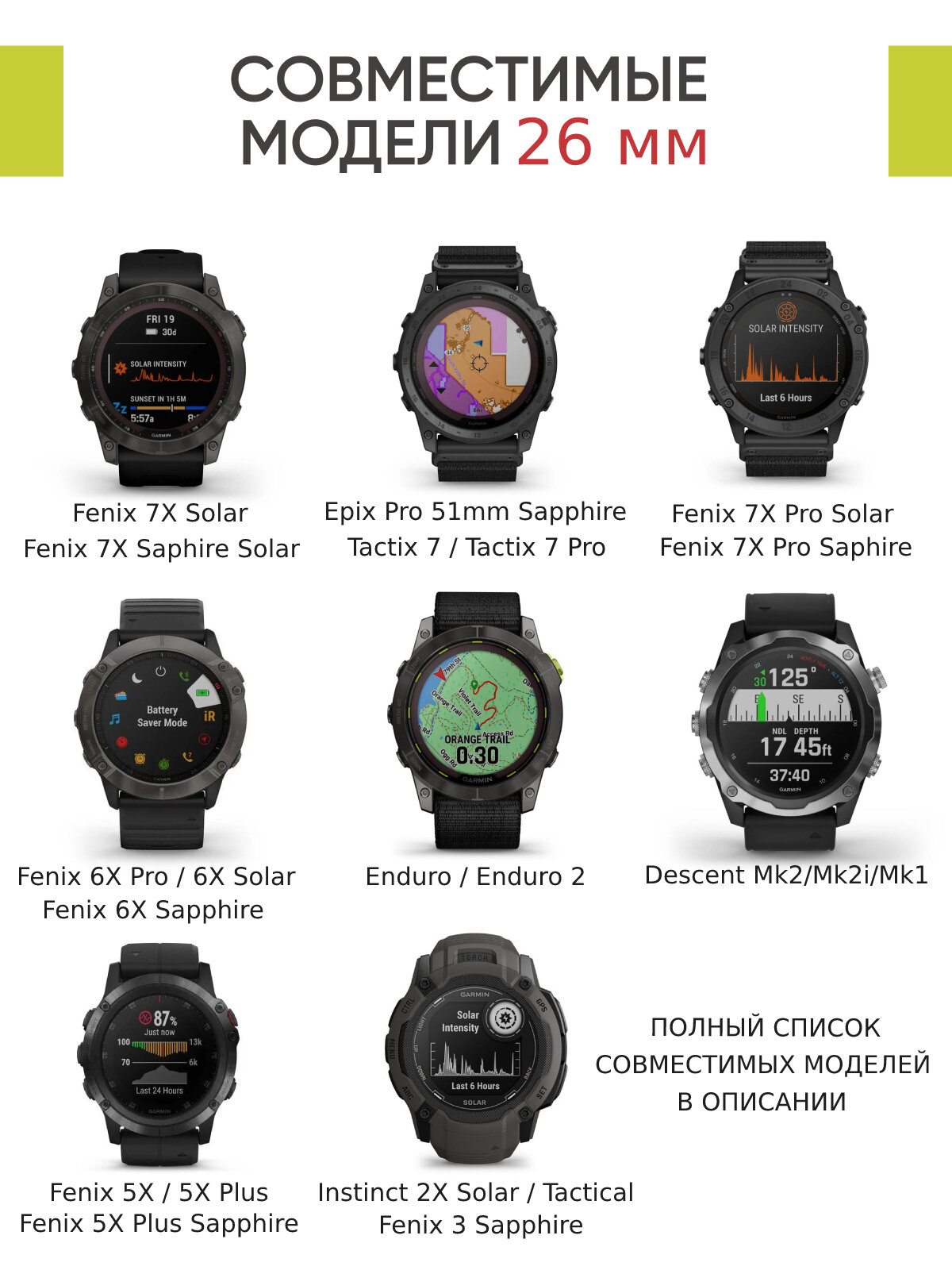 | Совместимые модели умных часов | Garmin Descent Mk1, Garmin Descent Mk2, Garmin Descent Mk2i, Garmin Fenix 3, Garmin Fenix 3 HR, Garmin Fenix 3 Sapphire, Garmin Fenix 5X, Garmin Fenix 5x Plus, Garmin Fenix 6X Pro Solar, Garmin Fenix 6x, Garmin Fenix 6x Pro, Garmin Fenix 7X Solar, Garmin Fenix 7x, Garmin Tactix Delta Solar |
