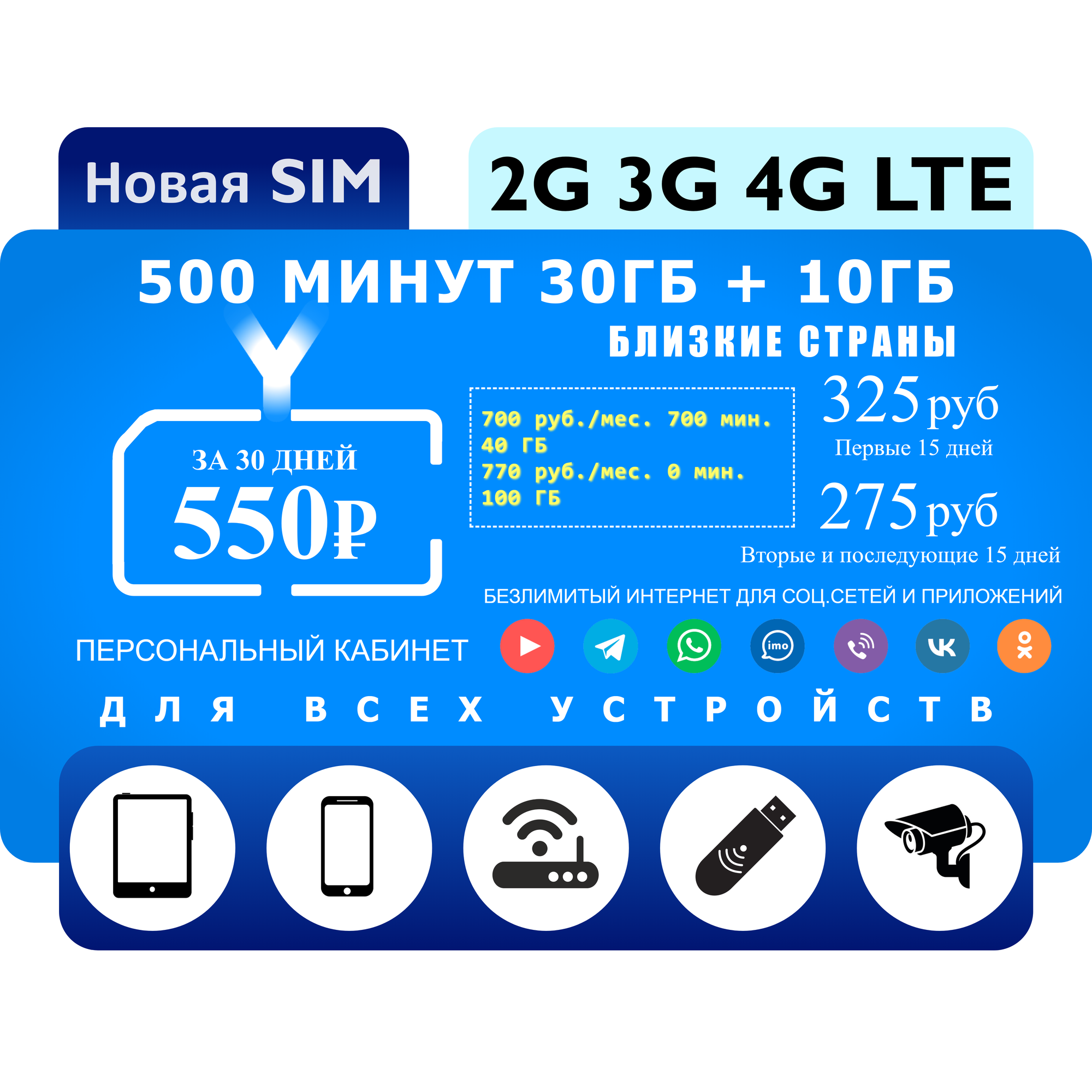 SIM-карта Безлимит по РФ с Wi Fi, для всех устройств, 990 р / в месяц/ сим карта