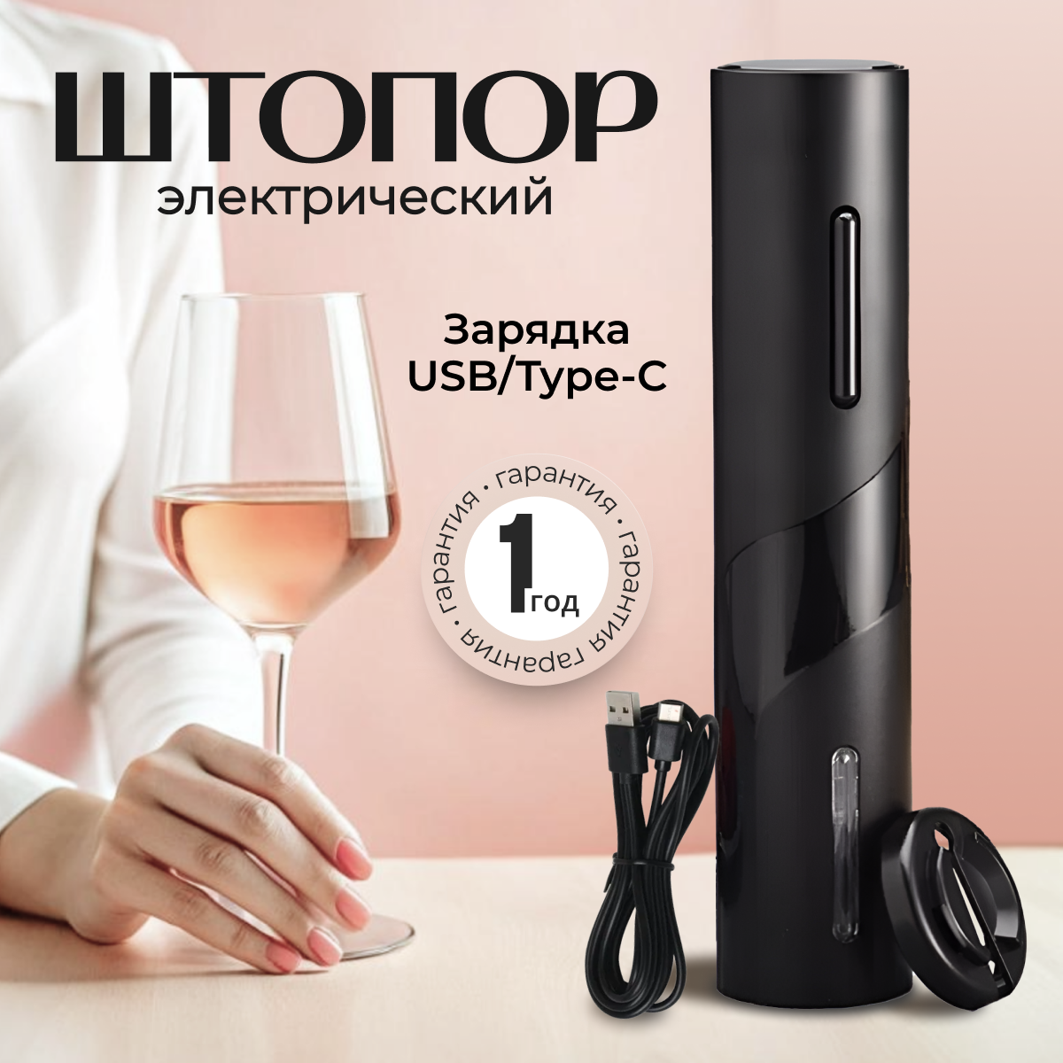 | Дополнительная информация | подходит для открытия бутылок с вином и не подходит для открытия бутылок с шампанским; в комплектацию входит штопор, нож для фольги, провод USB/Type-C. |