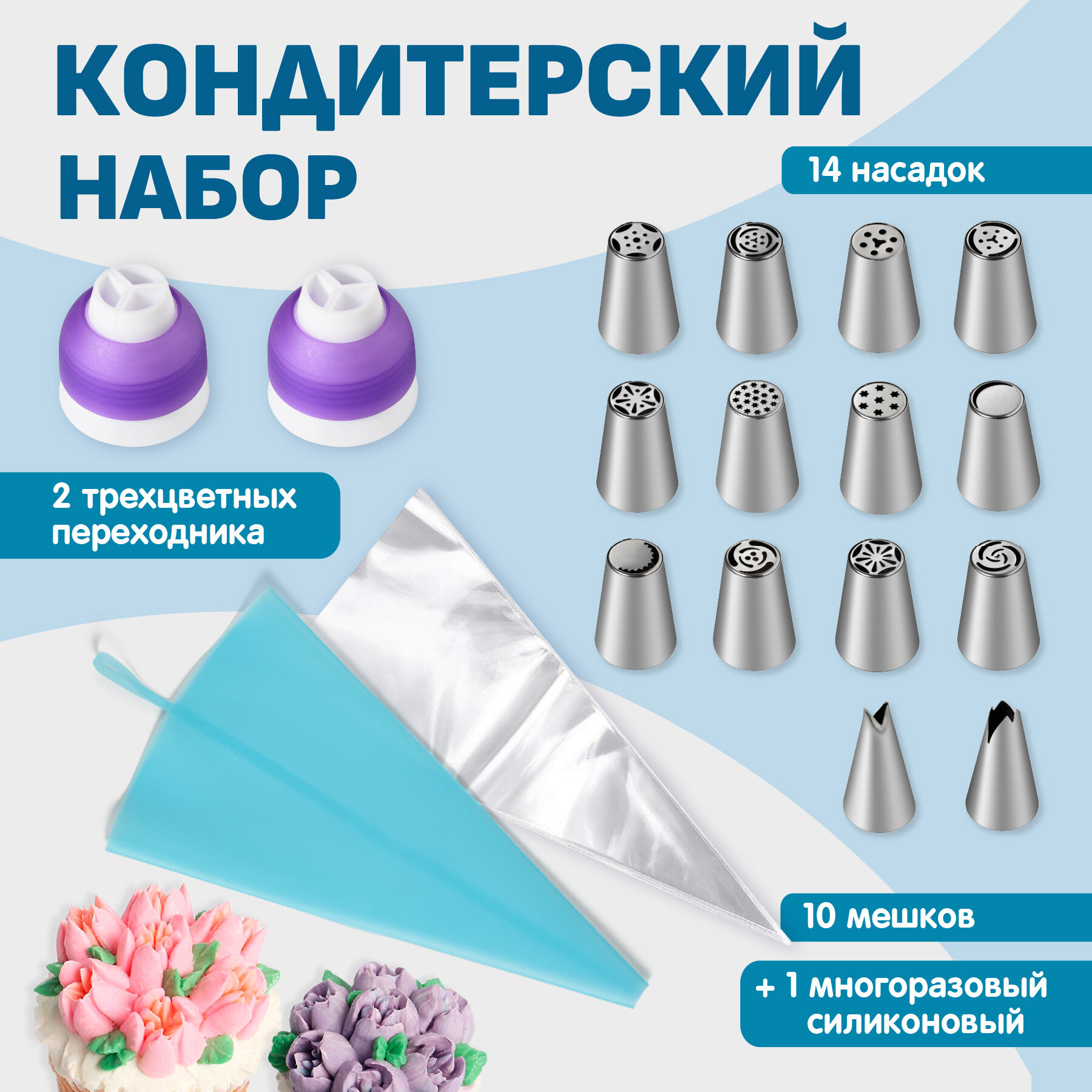 | Комплектация | Набор кондитерских насадок 23 шт. с адаптером + 100 кондитерских мешков |