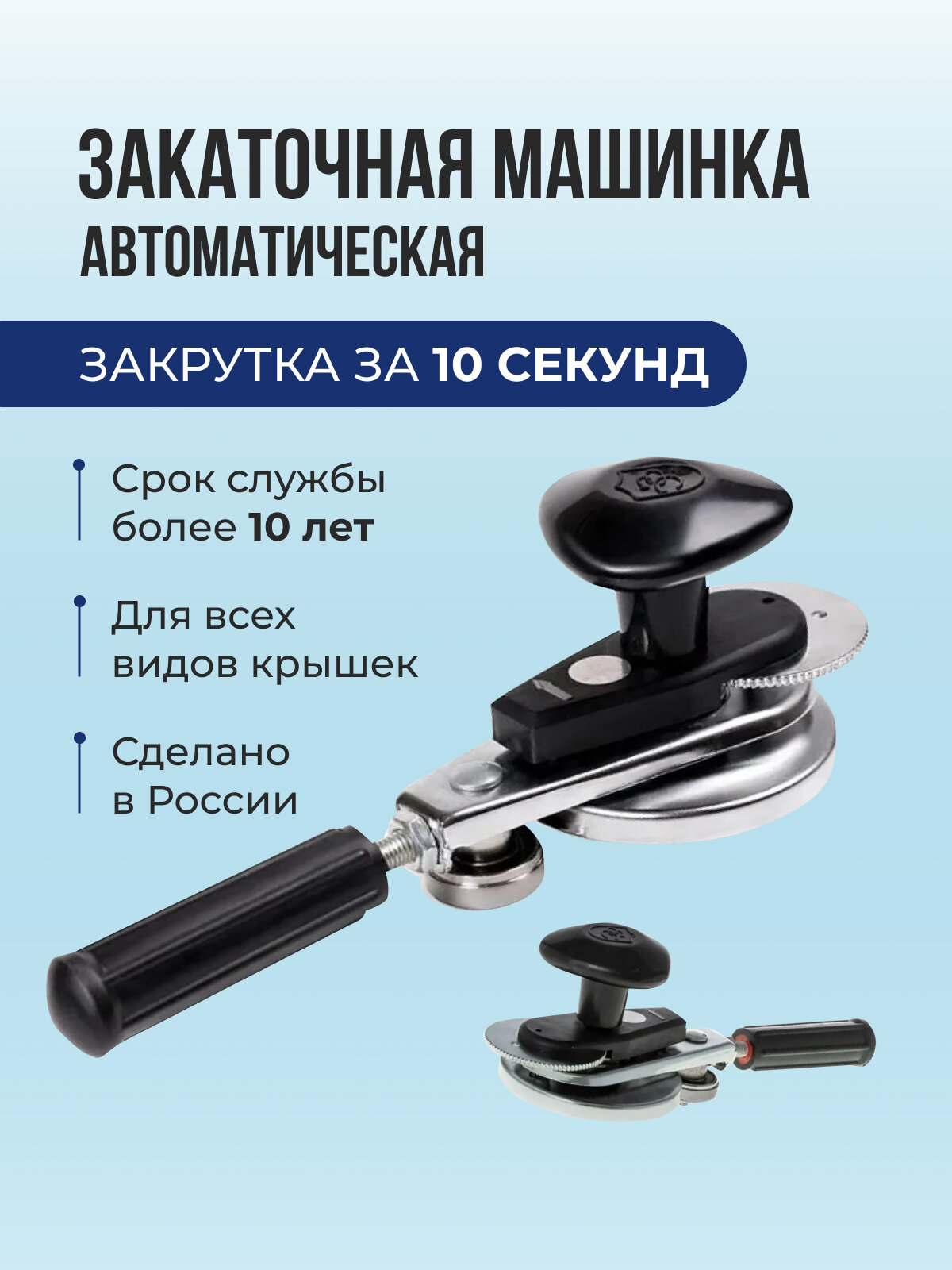 | Дополнительная информация | Для закатки нужно сделать всего 6-7 оборотов до характерного щелчка. Срок службы более 10 лет. |