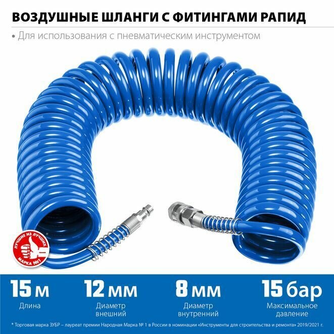 ЗУБР 15 м, 8х12 мм, 15 бар, шланг воздушный, спиральный с фитингами рапид 6472-15 Профессионал