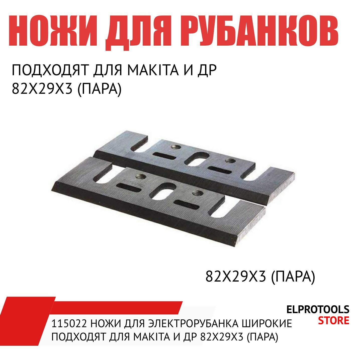 | Подробная комплектация | 115022 Ножи для электрорубанка широкие подходят для Makita и др 82х29х3 в блистере .(пара) |