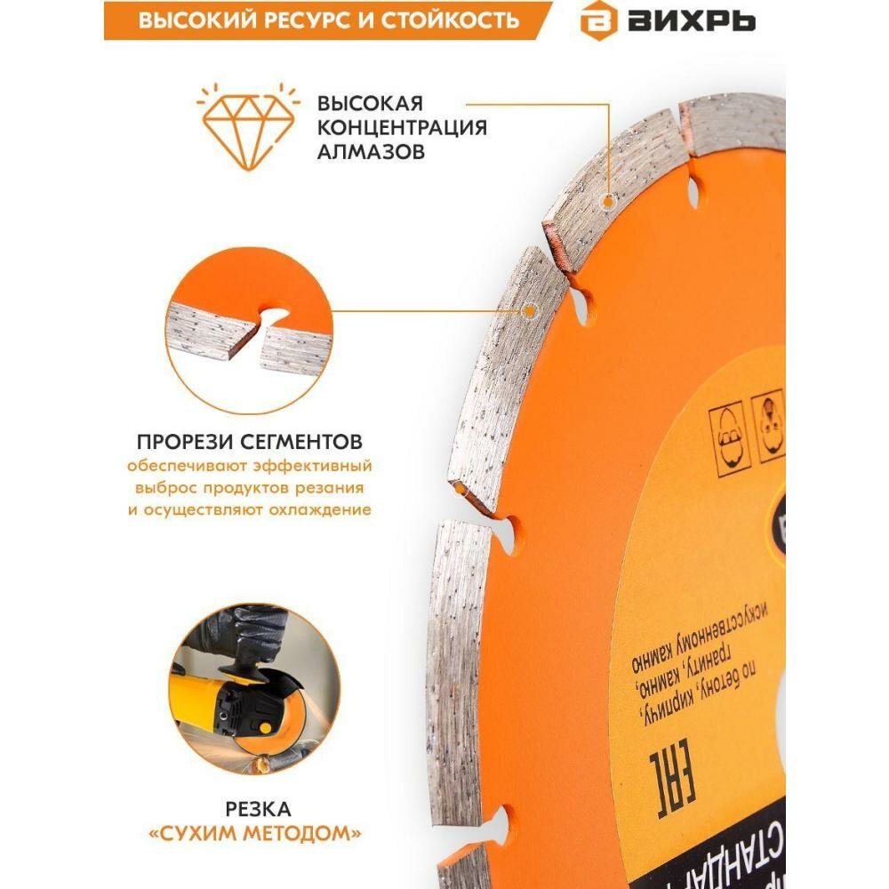 | Дополнительная информация | Диск алмазный сегментный отрезной 230 х 22,2 мм «сухая резка» Вихрь СТАНДАРТ алмазный диск для болгарки (УШМ), для штробореза 73/10/3/16 |