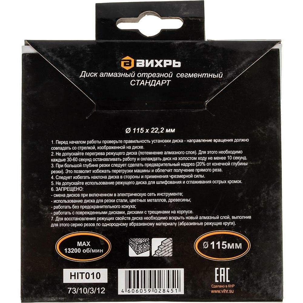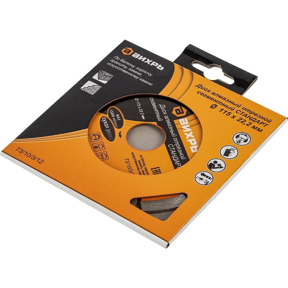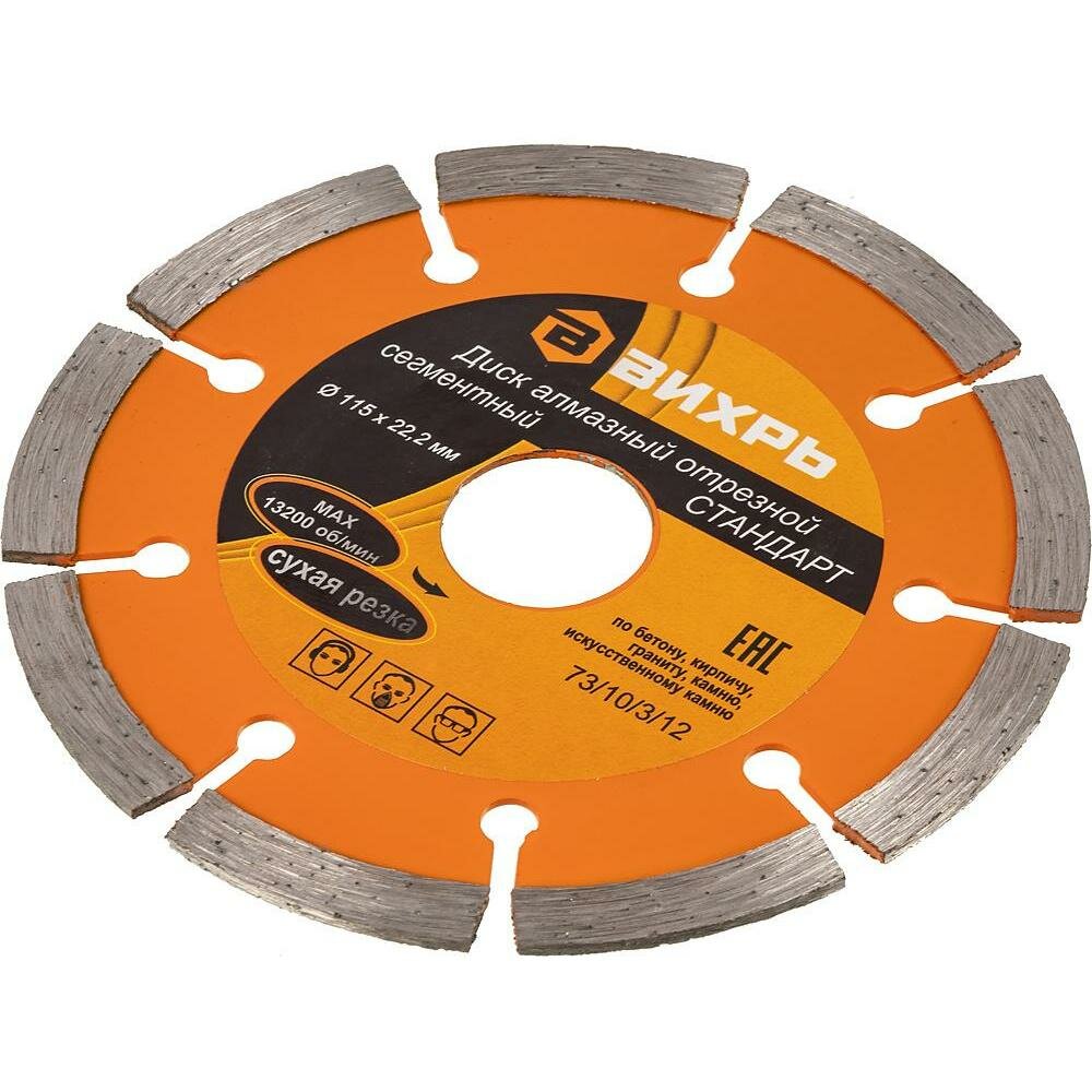Диск алмазный Вихрь стандарт, отрезной сегментный 115 х 22,2 мм, сухая резка, 73/10/3/12