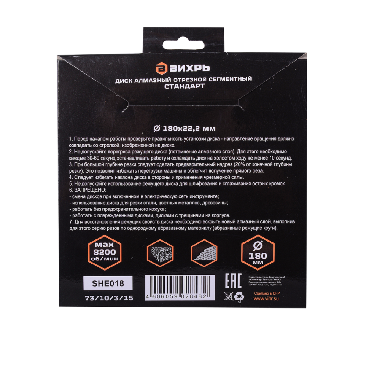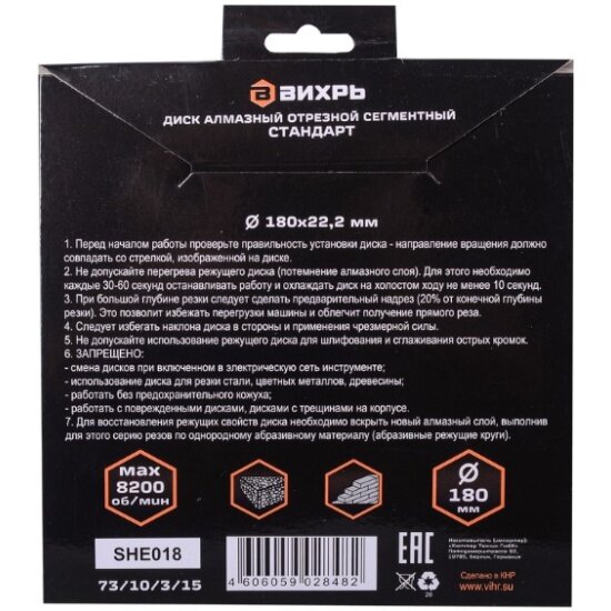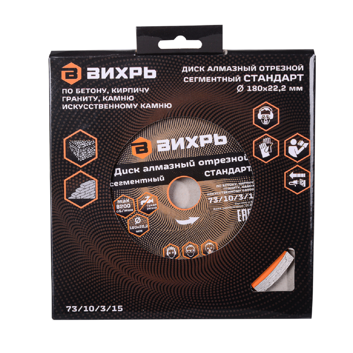 Диск алмазный сегментный Вихрь стандарт 180х22.2 мм. 73/10/3/15 по бетону, кирпичу, граниту