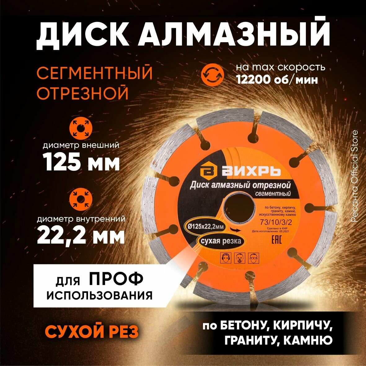 Диск алмазный Вихрь отрезной сегментный 125х22,2 мм, сухая резка, 73/10/3/2