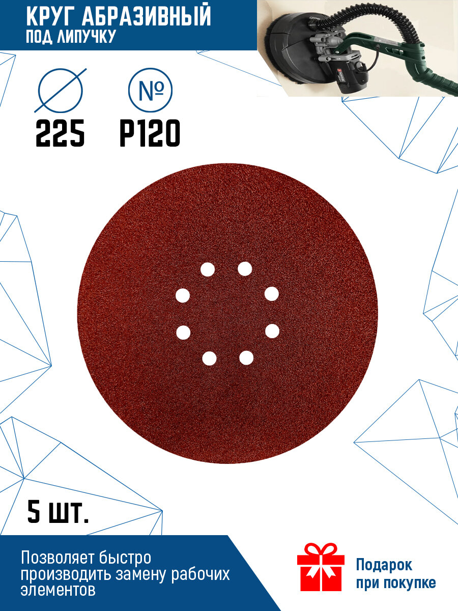 СохранитьШлифовальный круг 225 мм. на липучке, 5 шт, P120, 8 отверстий, для шлифовальной машинки Жираф интересное:
