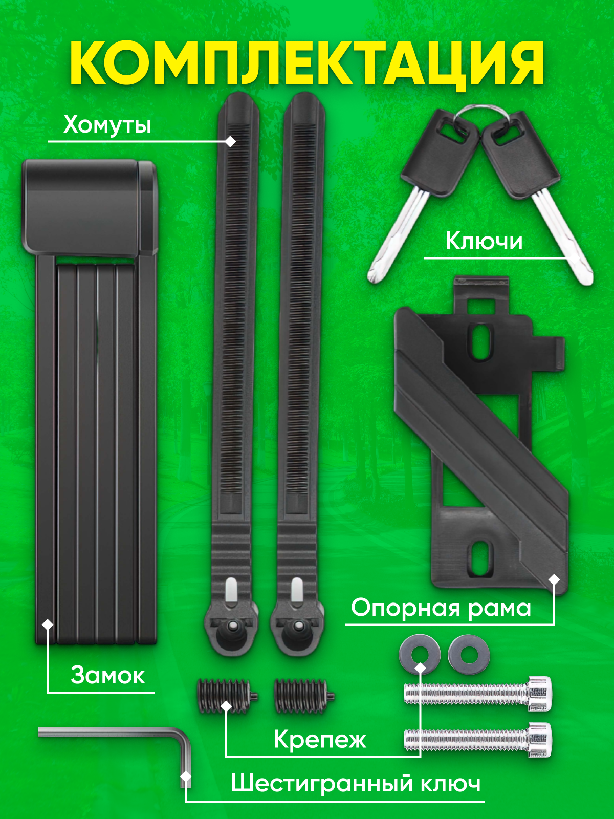 | Дополнительная информация | Замок - 1 шт. Крепежный комплект - 1 шт.; Опорная рама - 1 шт. Ключ - 2 шт.; Шестигранный ключ - 1 шт. |