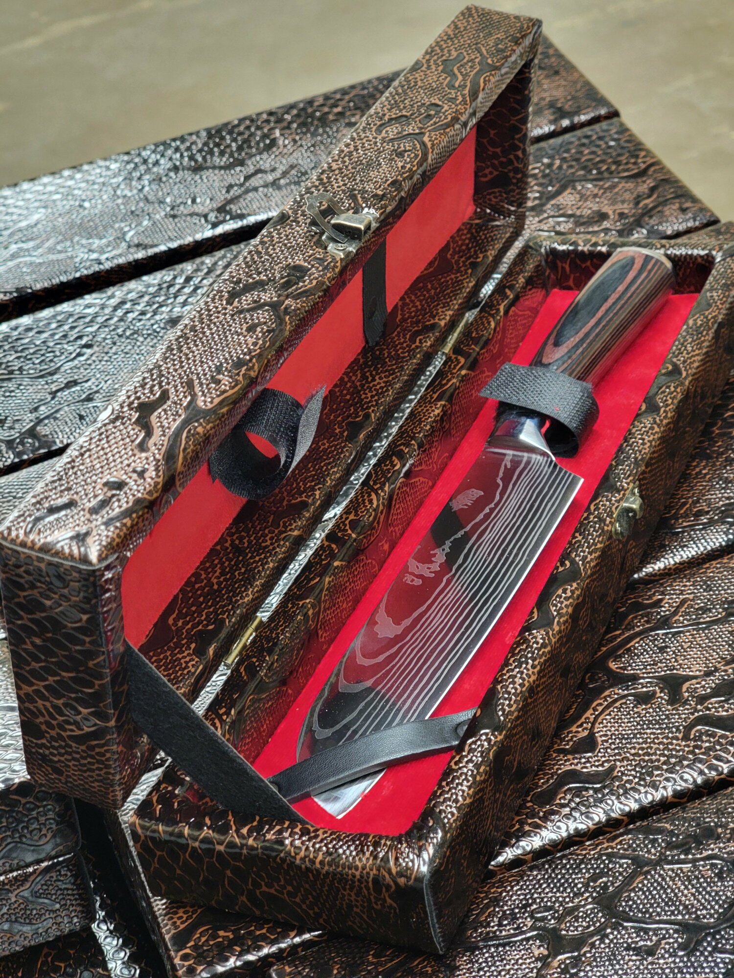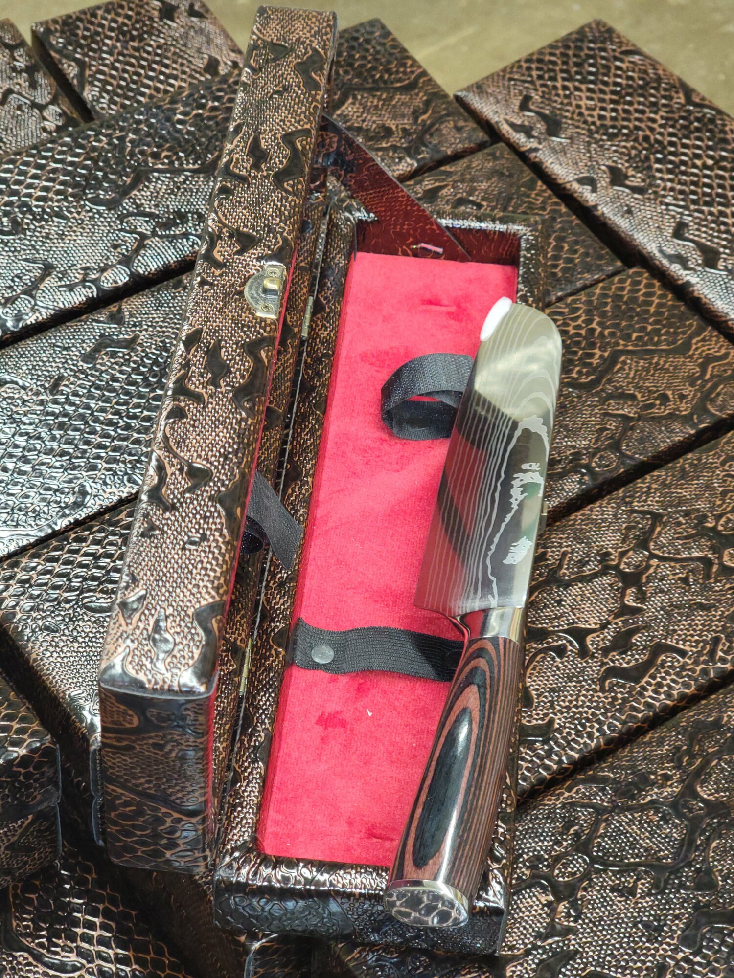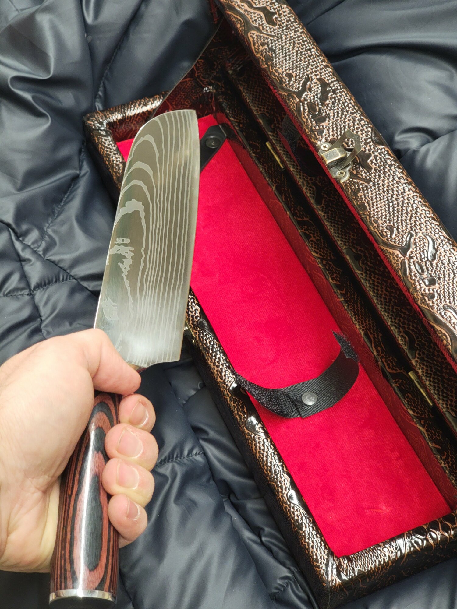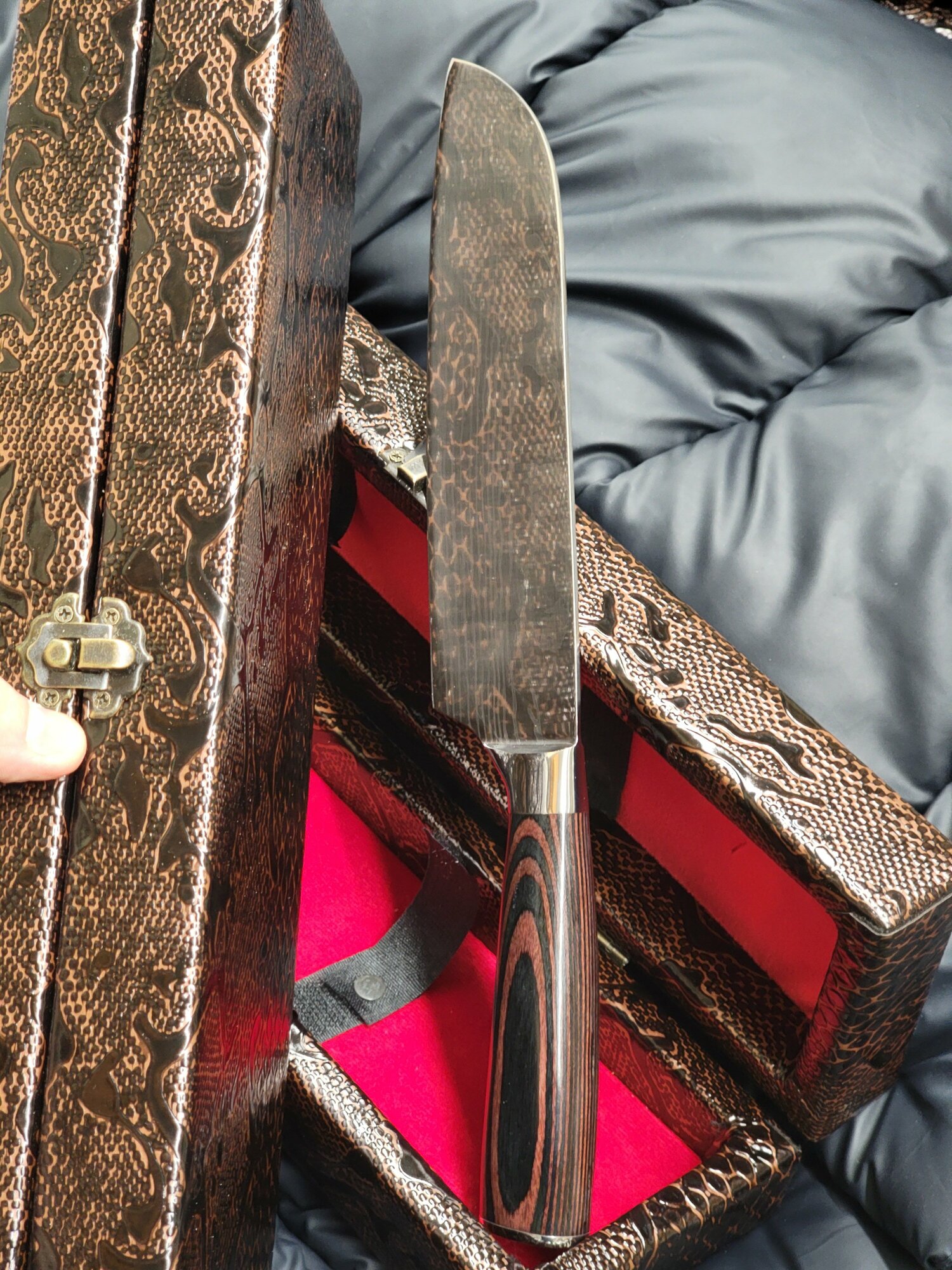| Дополнительная информация | Нож с чехлом в подарочном футляре из дерева и кожи |