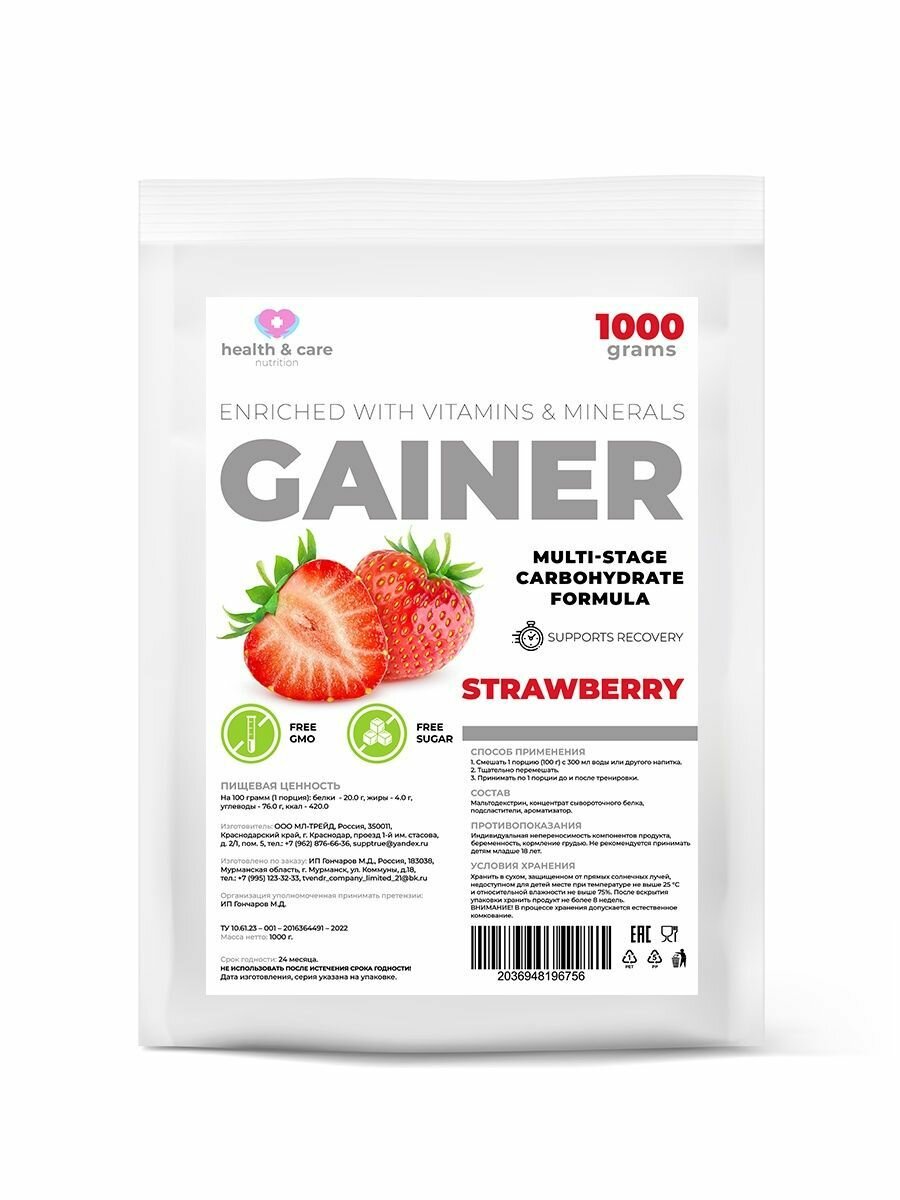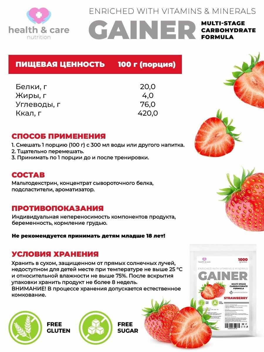 Купить health & care Гейнер высокоуглеводный со вкусом Клубника 1000г