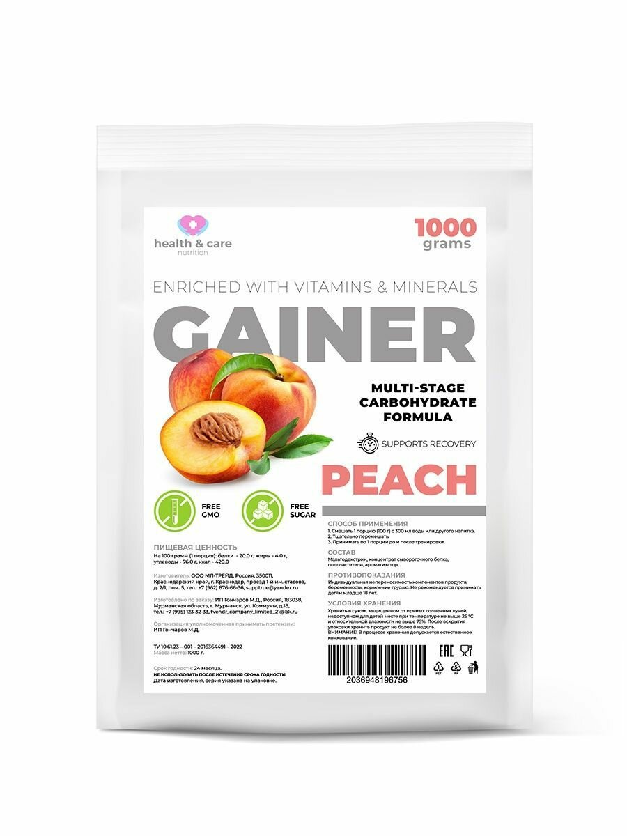 Купить health & care Гейнер высокоуглеводный со вкусом Персик 1000г