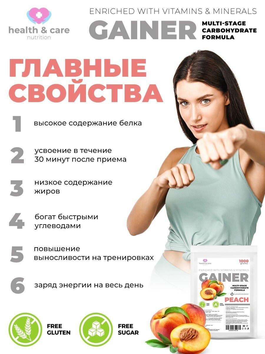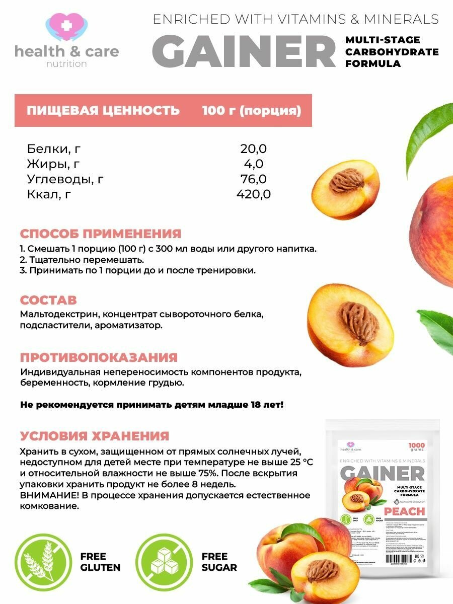 health & care Гейнер высокоуглеводный со вкусом Персик 1000г интересное: