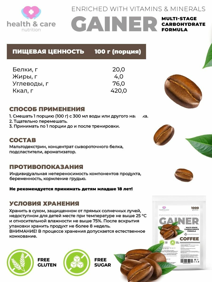 Купить health & care Гейнер высокоуглеводный со вкусом Кофе 1000г