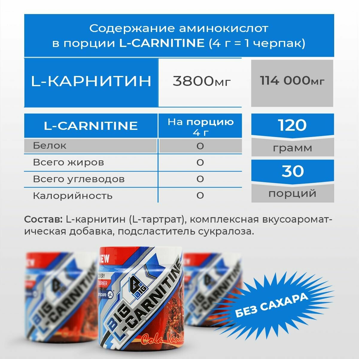 L-карнитин BIGSNT BIG CARNITINE для похудения, снижения веса, повышения выносливости / 120 г, 30 порций, вкус Кока-кола
