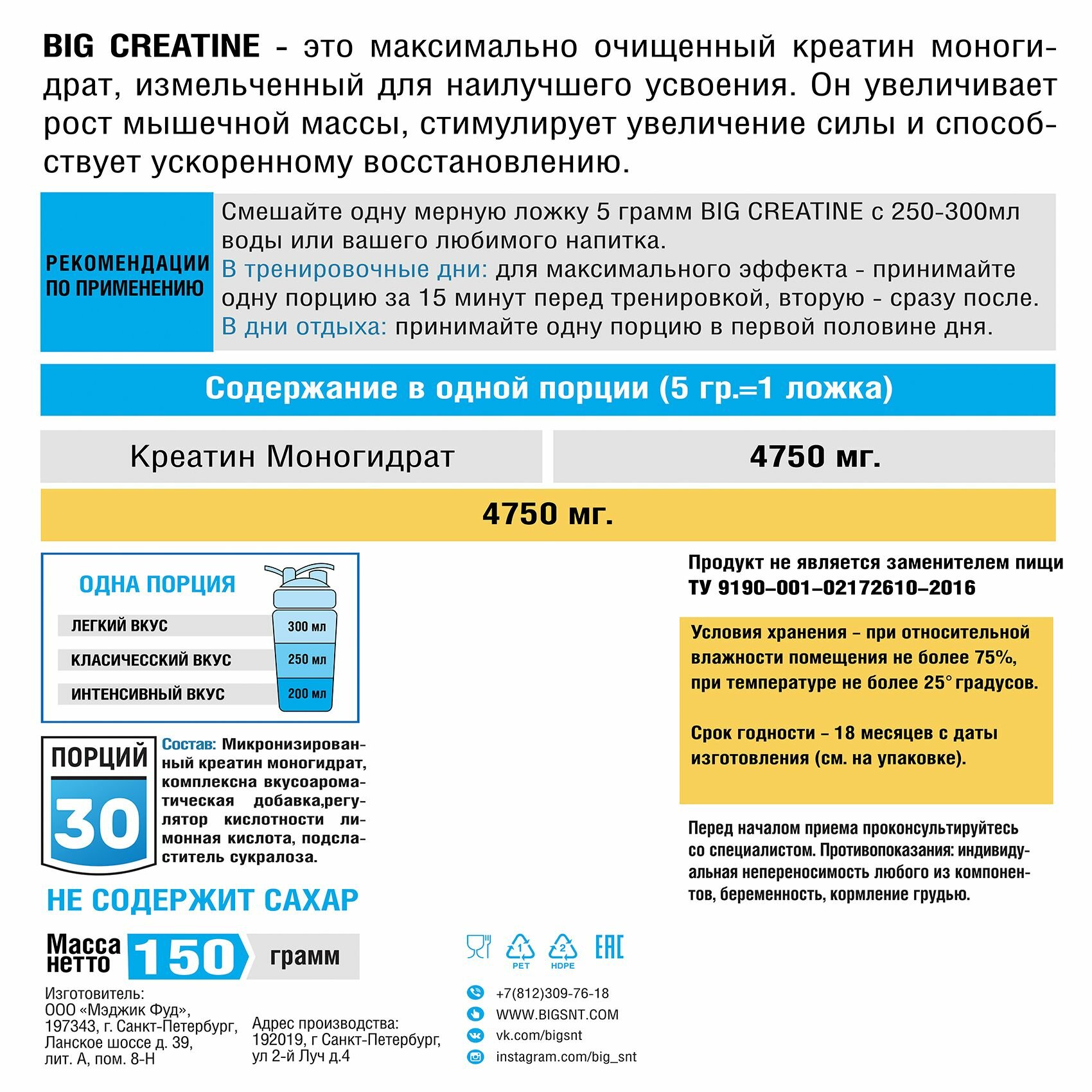 Креатин моногидрат BIGSNT BIG CREATINE для набора мышечной массы, силы и выносливости / 150 грамм, 30 порций, Без вкуса