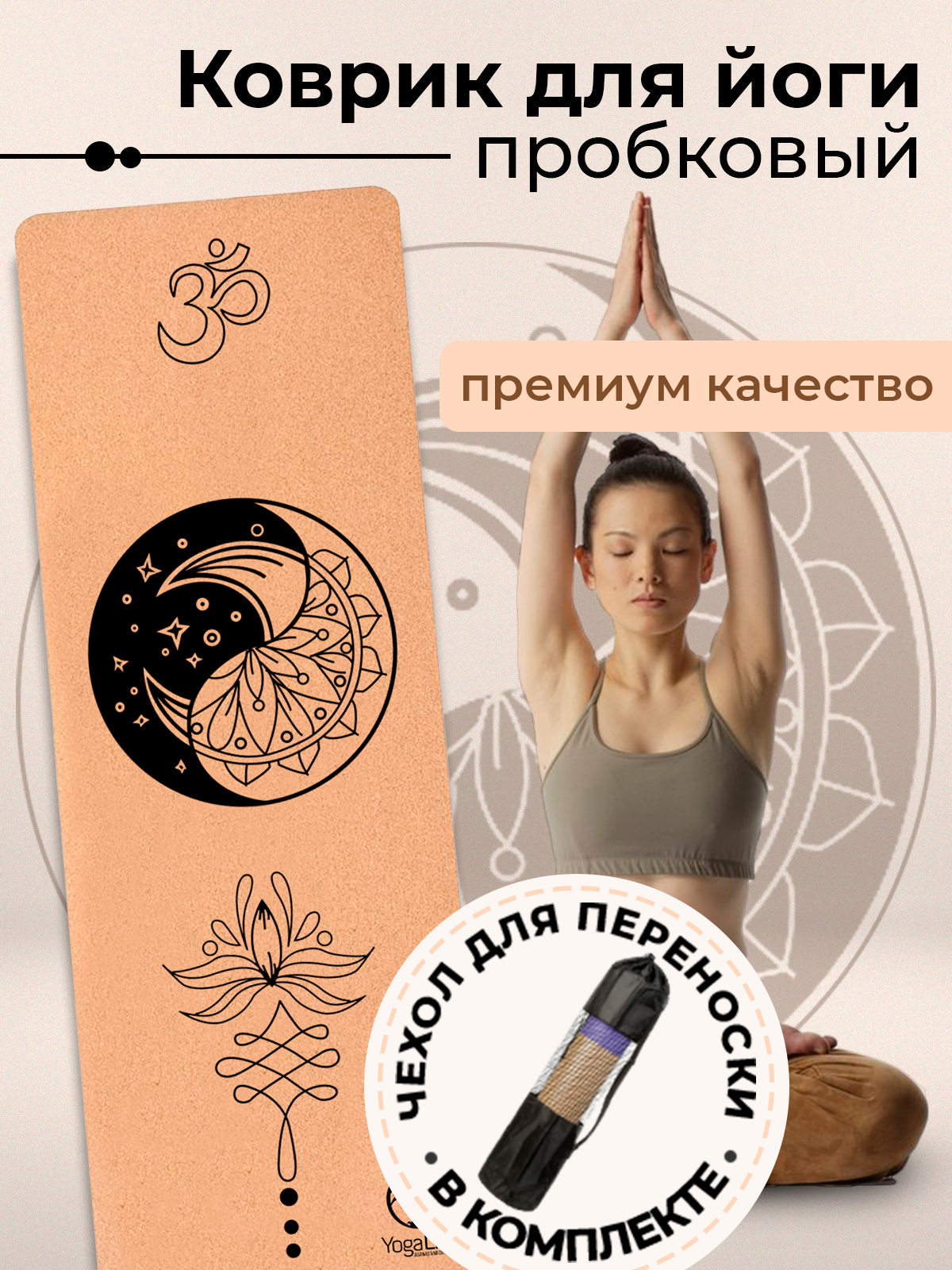 YogaLife / Коврик для йоги и фитнеса пробковый 183х61х0,6 см. Натуральная пробка и каучук. Толщина 6 мм. Ремень-стяжка и чехол в комплекте (4)