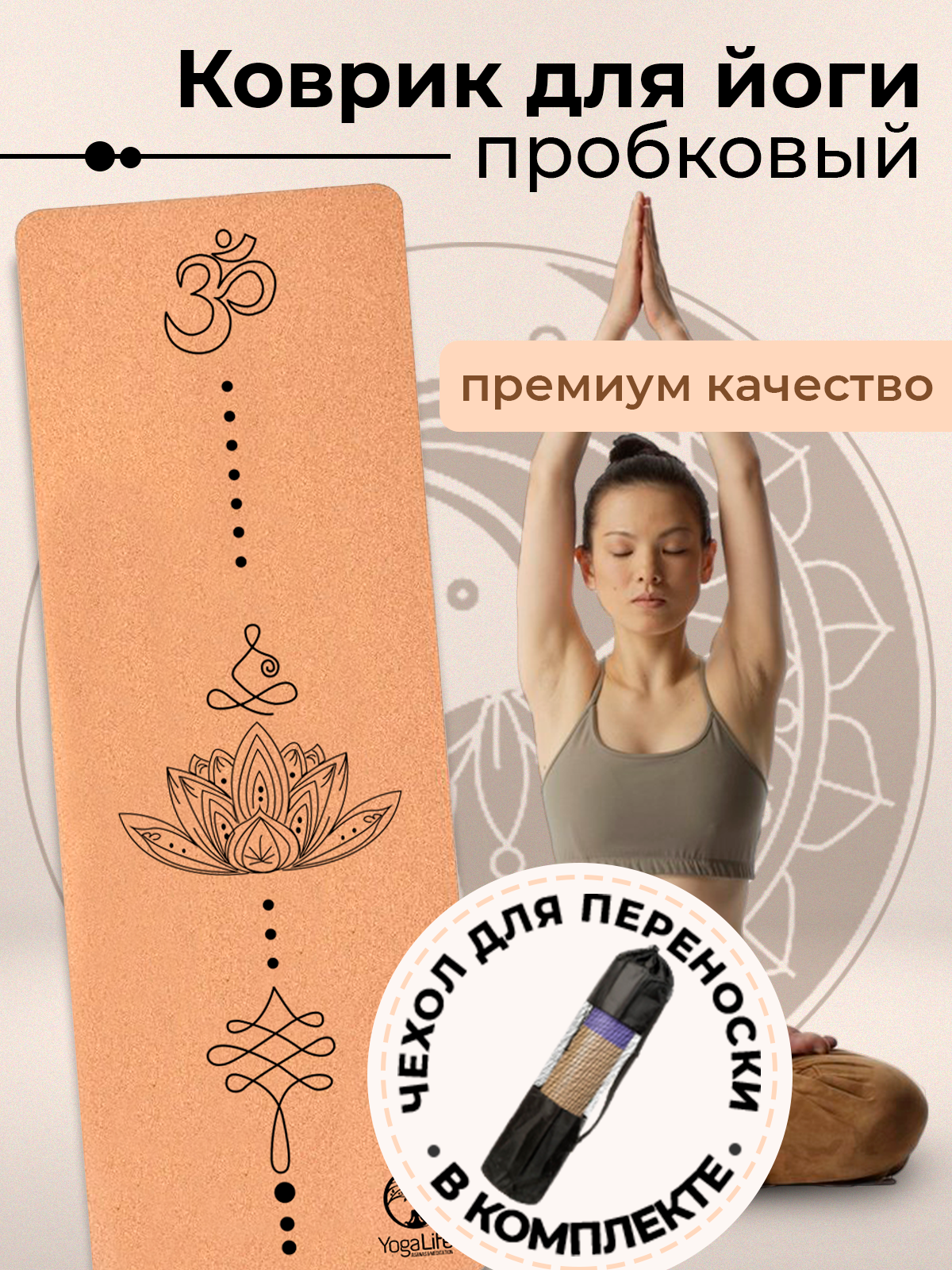 YogaLife / Коврик для йоги и фитнеса пробковый 183х61х0,6 см. Натуральная пробка и каучук. Толщина 6 мм. Ремень-стяжка и чехол в комплекте(1)