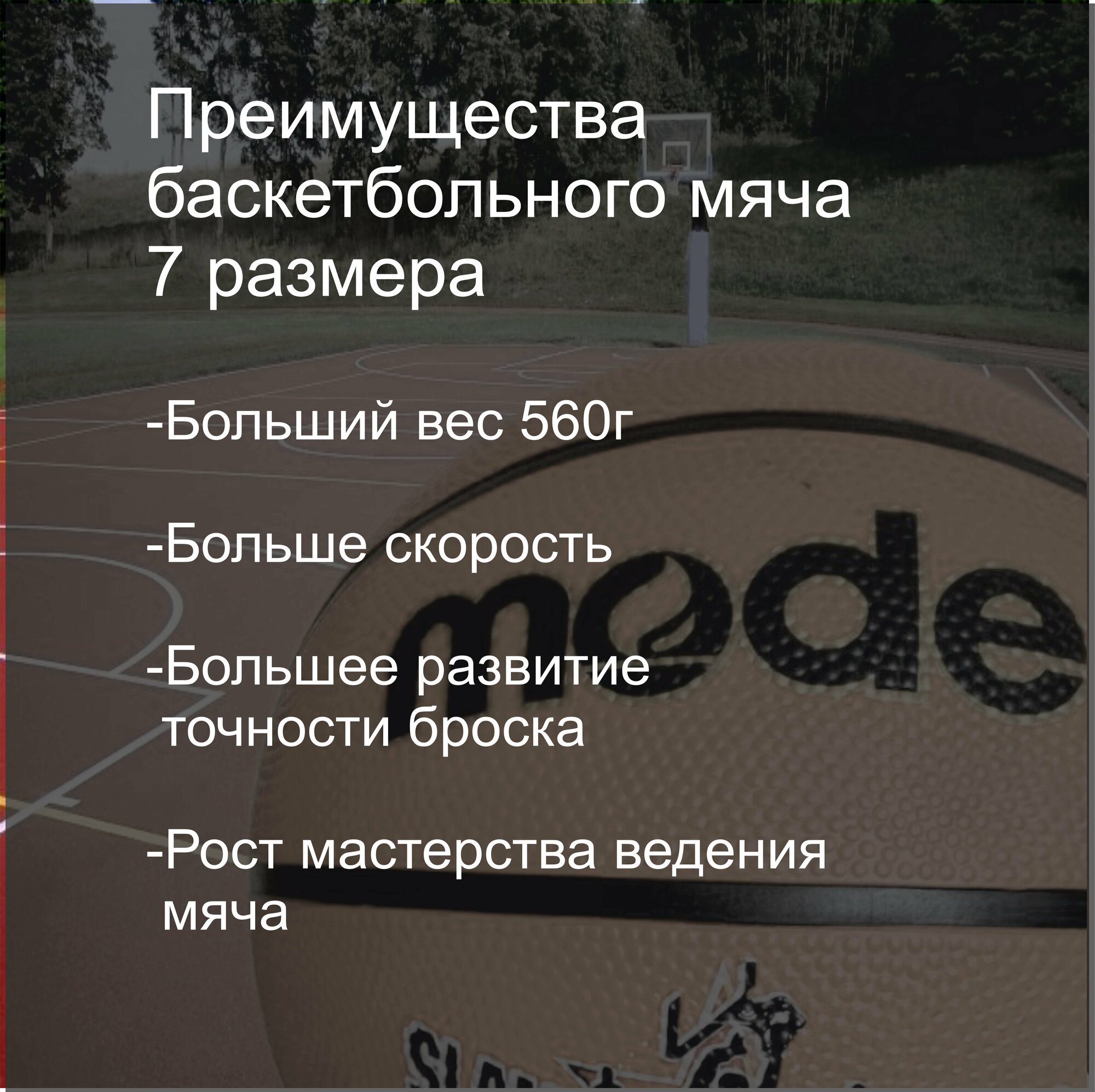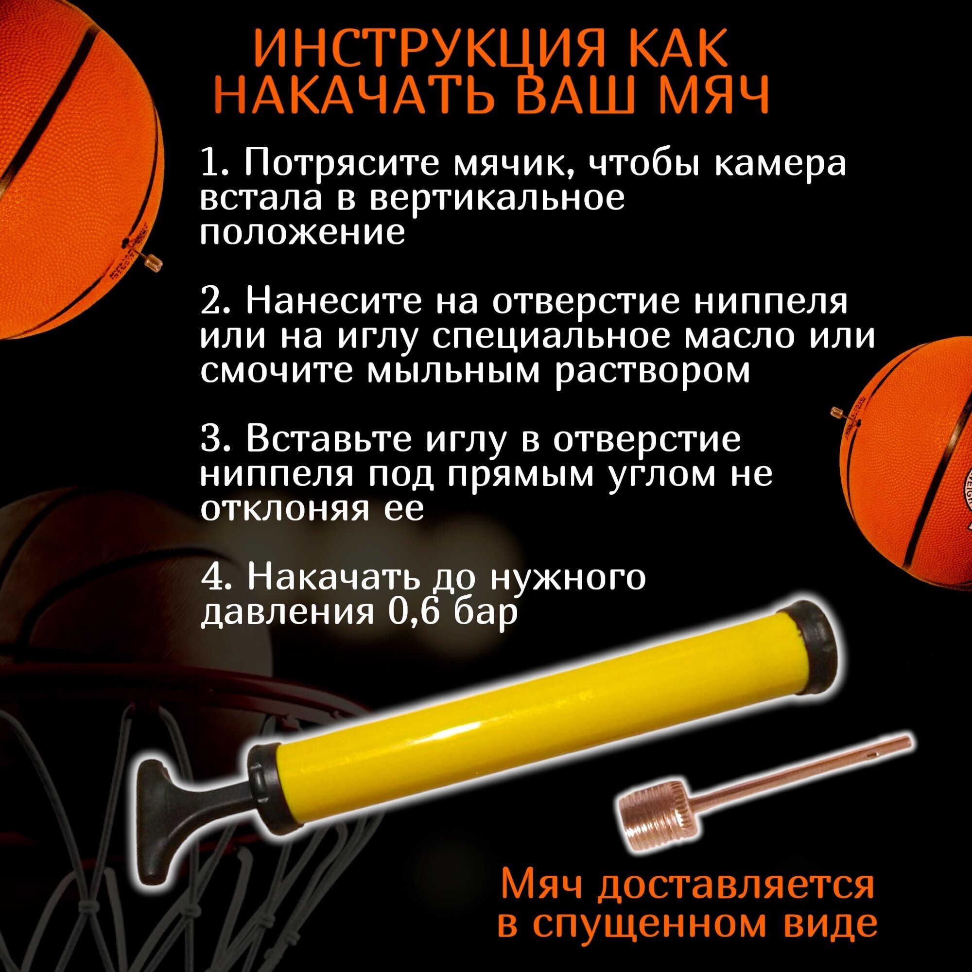 | Дополнительная информация | Чтобы баскетбольный мяч 7 размера дольше не сдувался, необходимо смазать иглу для накачивания маслом или жидким мылом, чтобы не повредить ниппель баскетбольного мяча. |