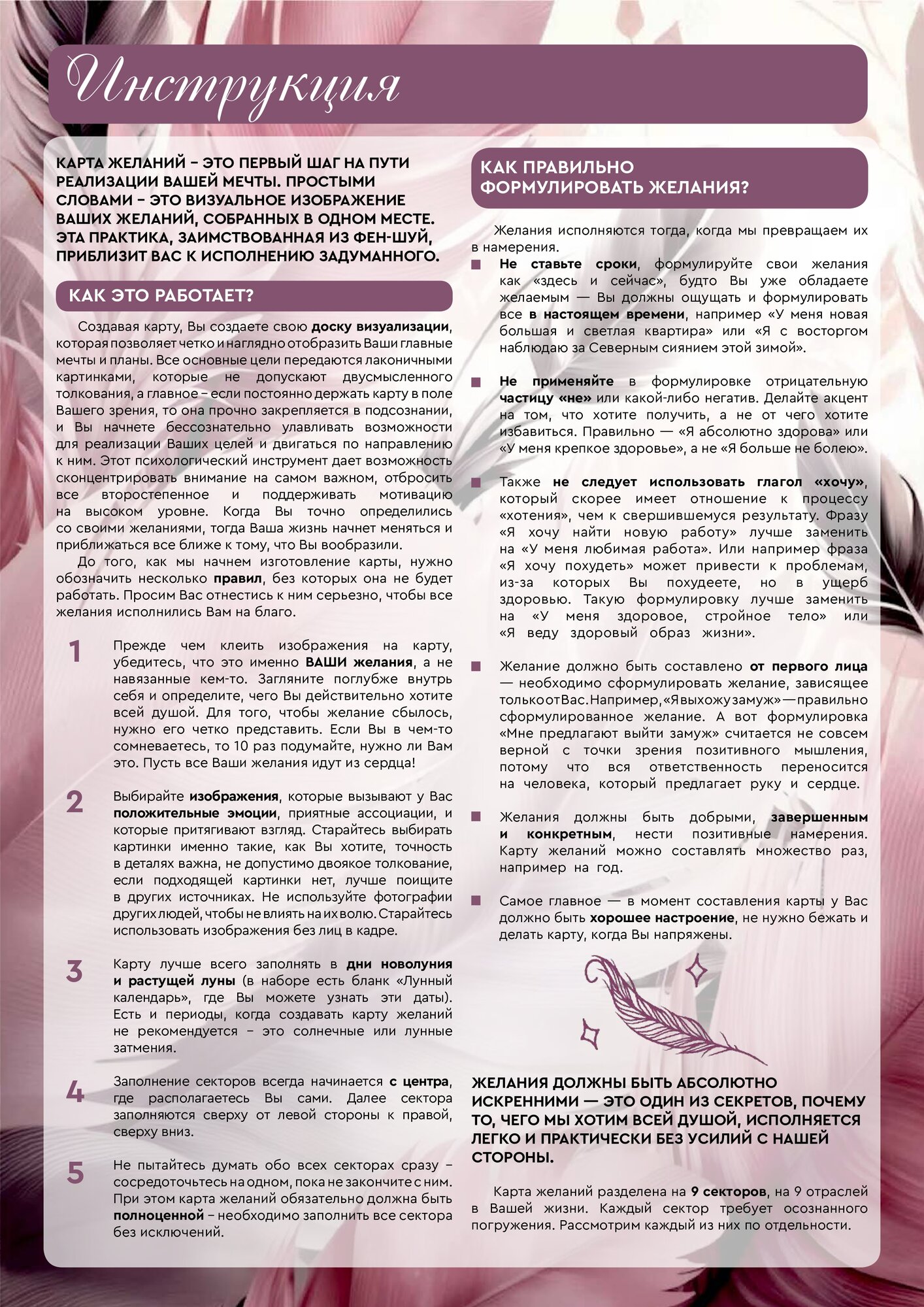 | Подробная комплектация | карта желаний ( доска визуализации - сетка Багуа ), наклейки (самоклеящаяся основа) 270 шт, чеки изобилия 10 штук, мои цели, инструкция, милые как из пинтерест картинки и наклейки для карты желаний, мандала для раскрашивания, лунный календарь 2024, список желаний 100 шт, трекер привычек, колесо жизненного баланса |