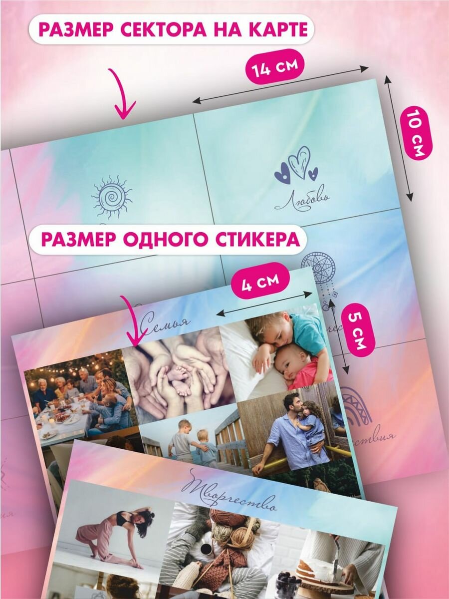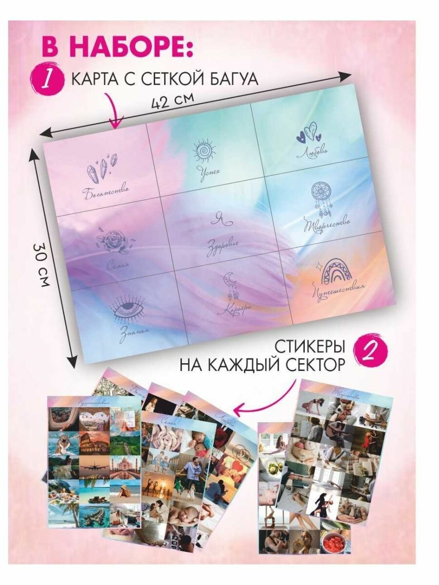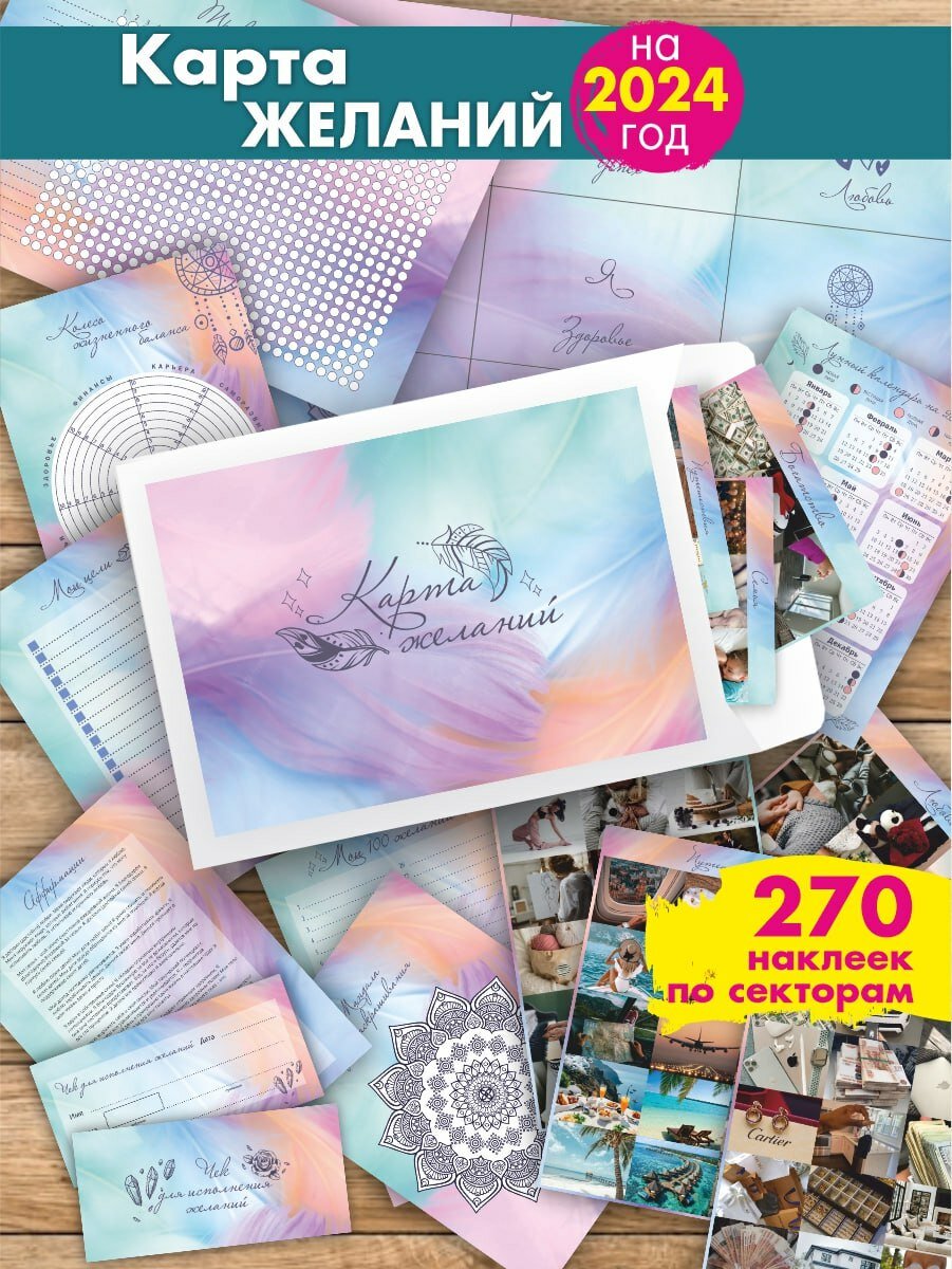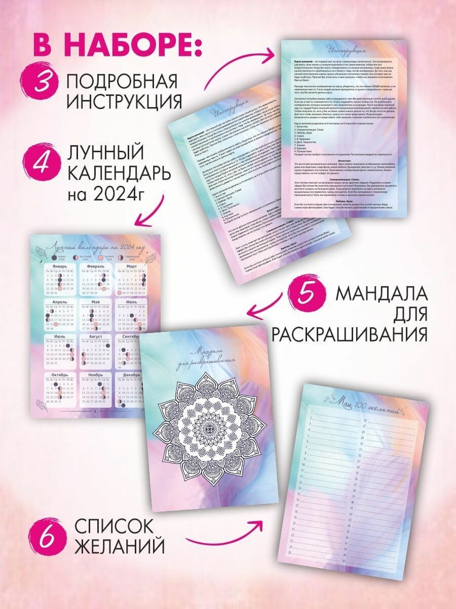 | Подробная комплектация | карта желаний ( доска визуализации - сетка Багуа ), наклейки (самоклеящаяся основа) 270 шт, чеки изобилия 10 штук, мои цели, инструкция, милые как из пинтерест картинки и наклейки для карты желаний, мандала для раскрашивания, лунный календарь 2024, список желаний 100 шт, трекер привычек, колесо жизненного баланса |
