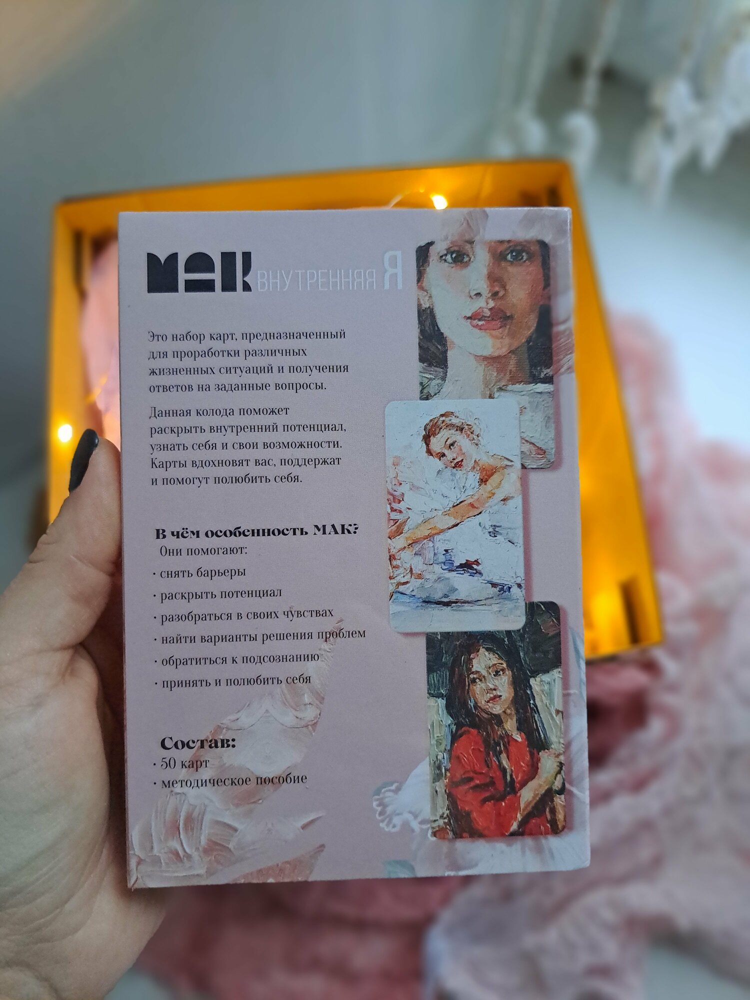 | Подробная комплектация | Карты метафорические 50 шт, инструкция |