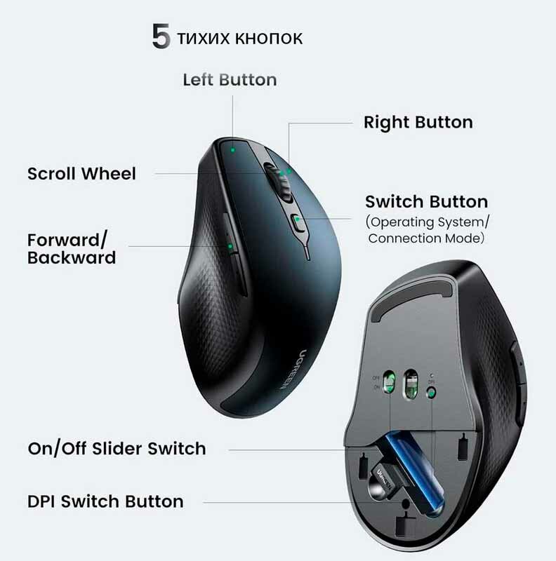 Мышка Ugreen MU101 (15807) Ergonomic Contoured-Shape Design Wireless Mouse 2.4 GHz&BT - Blue интересное: