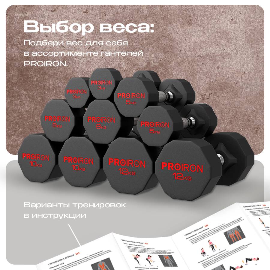 Гантели 8 кг 2 шт обрезиненные PROIRON, для фитнеса и спорта, черный и хром