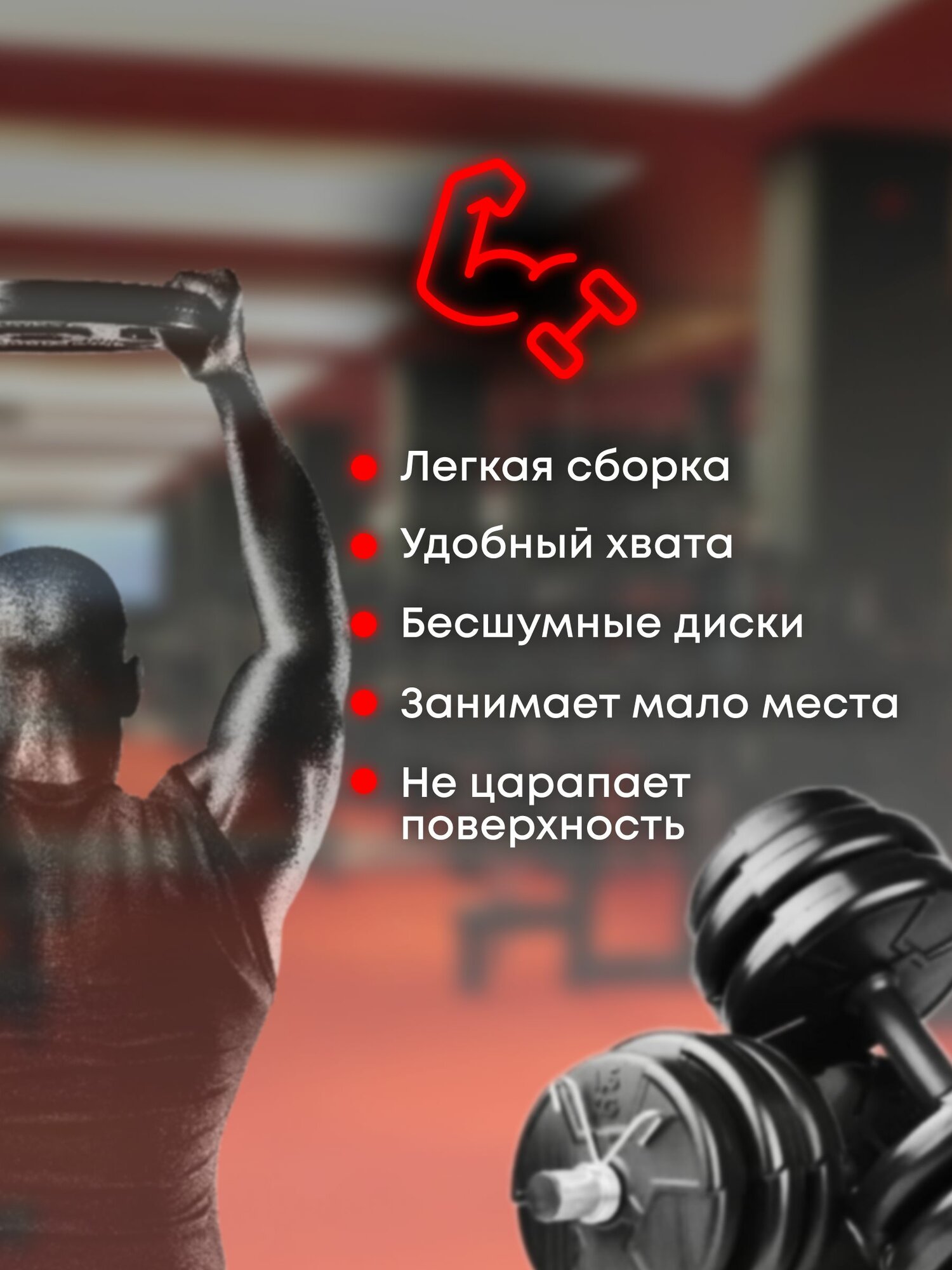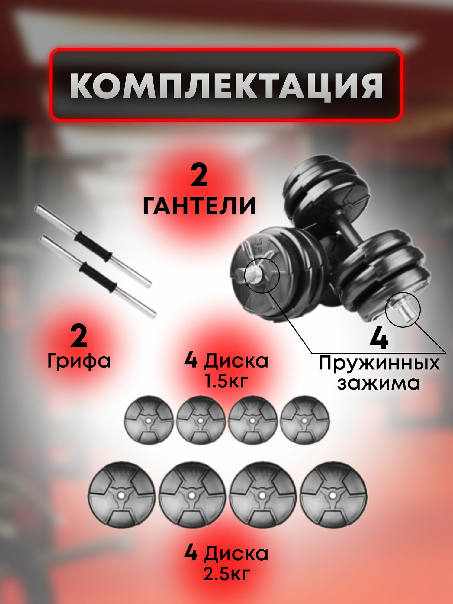 | Дополнительная информация | Комплектация: 4 диска - 2,5кг, 4*1,5кг, 4*1кг |